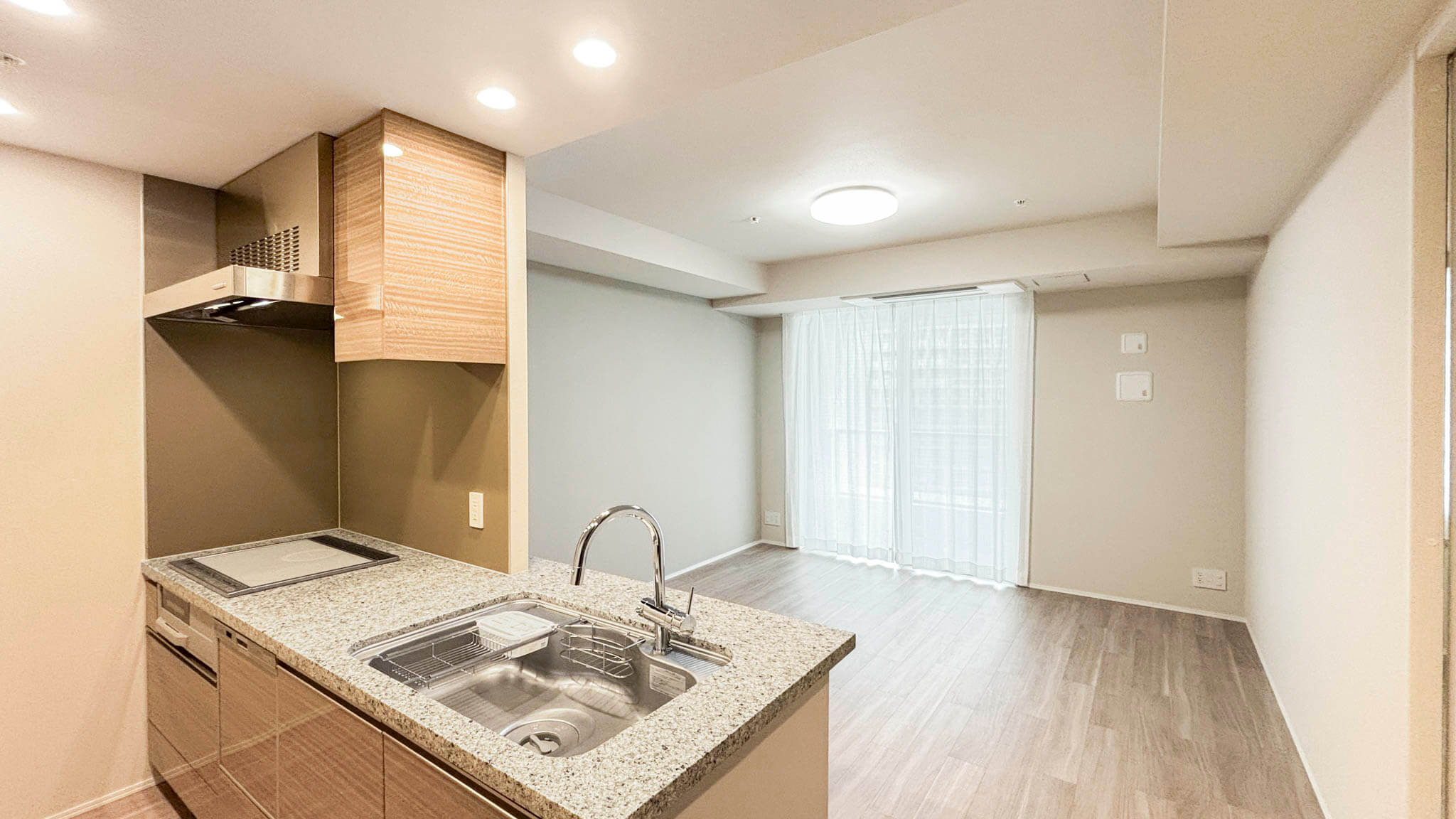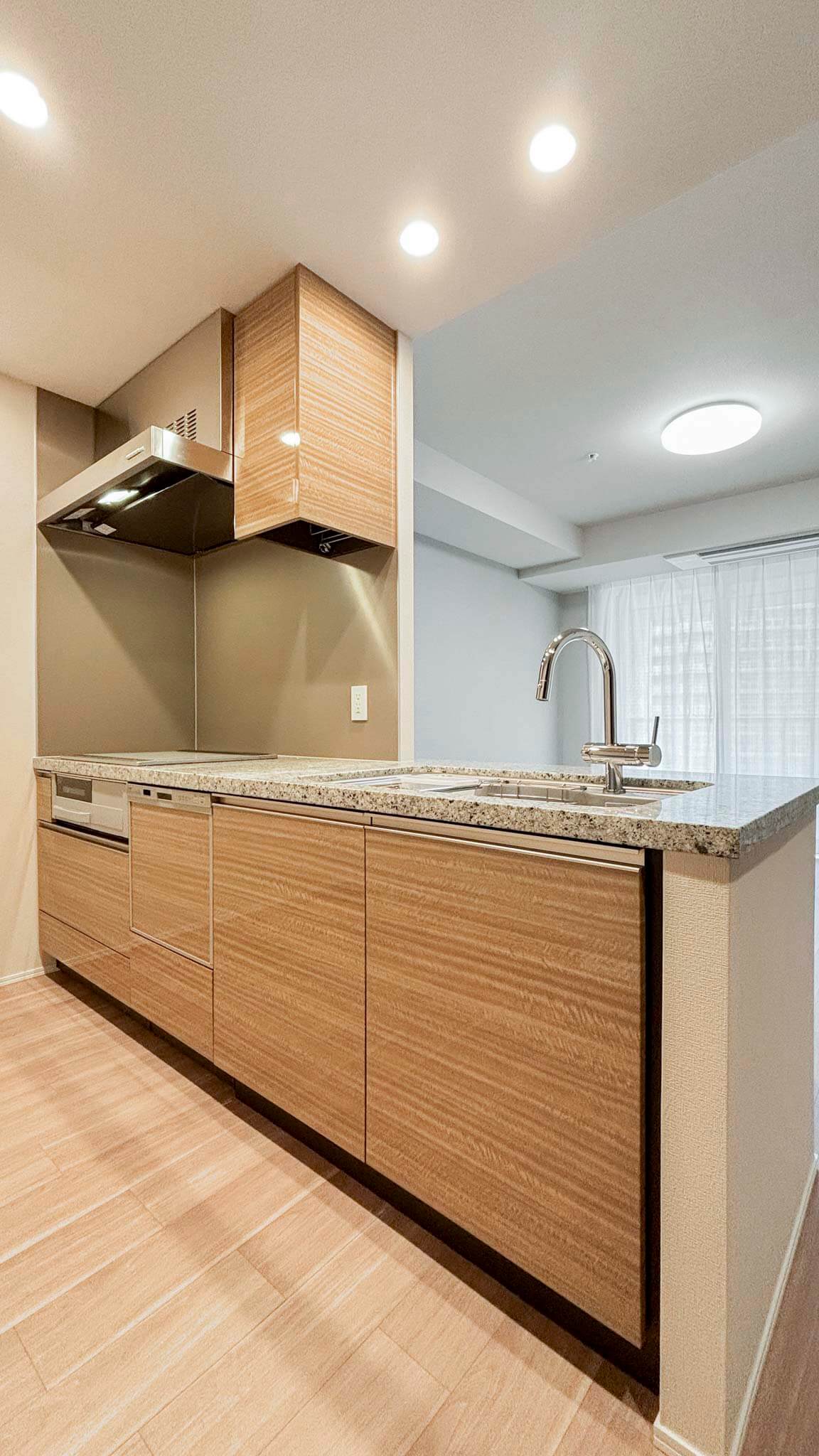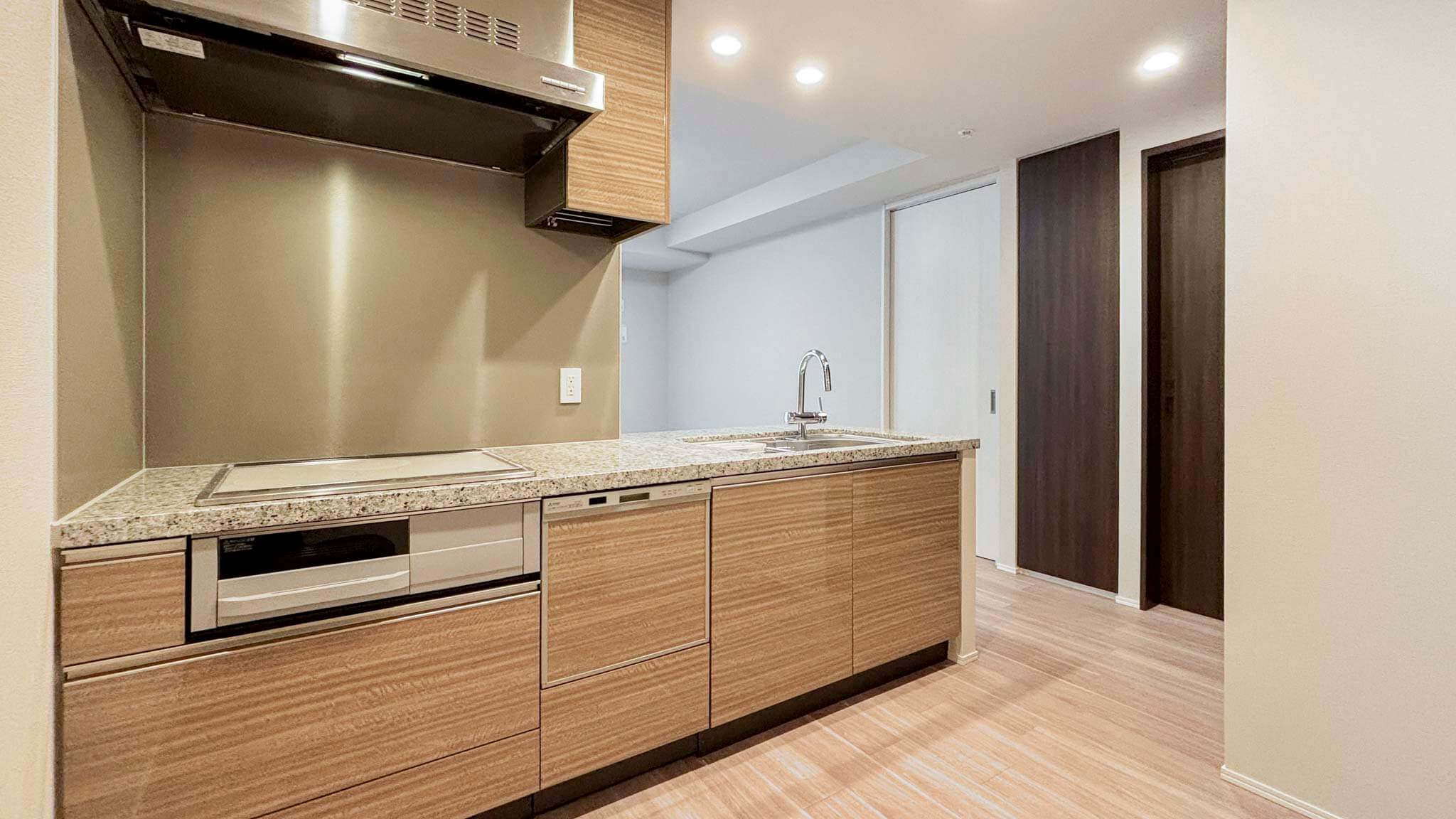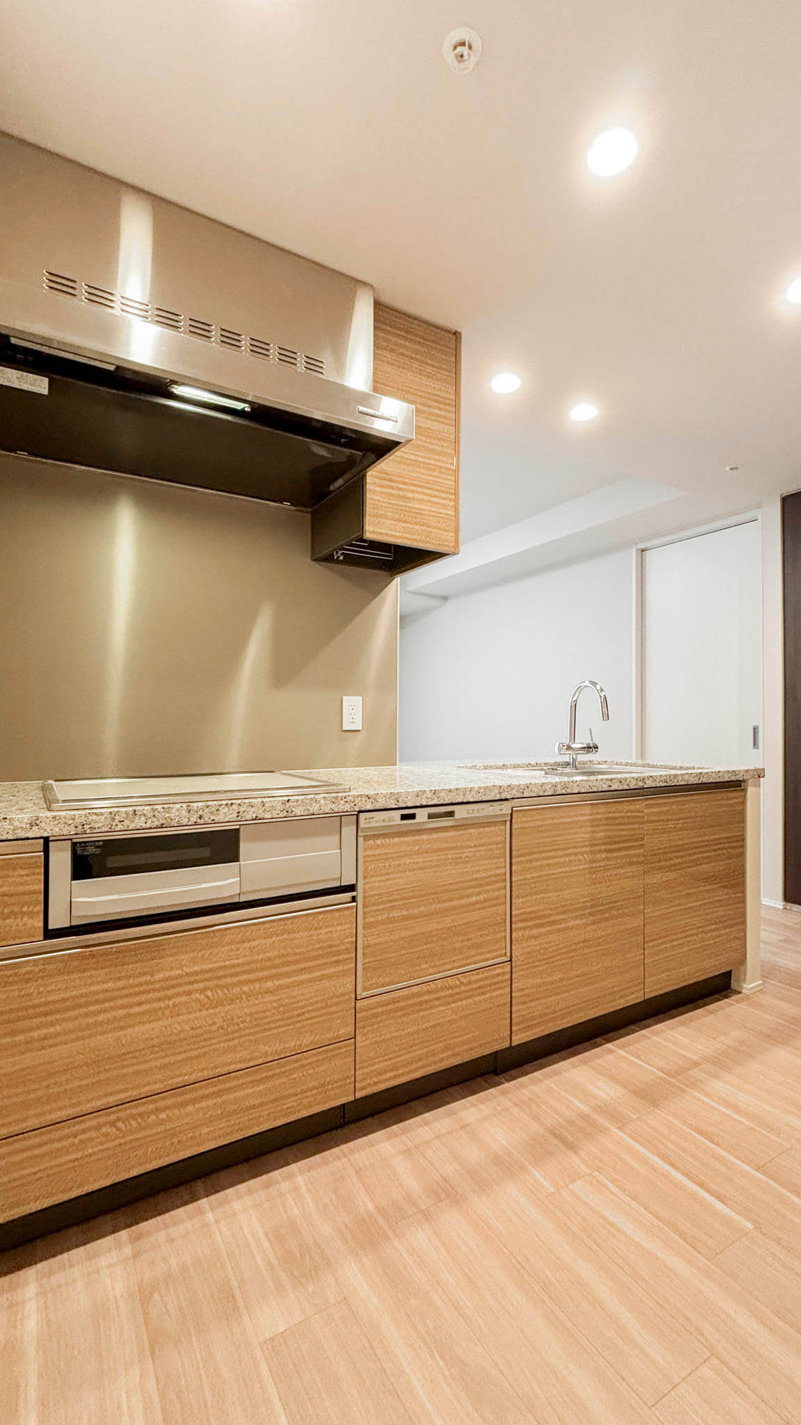 木目扉と石調カウンターのコントラストが美しく、高級感の漂うキッチン。シンク側からはリビングダイニングを見渡すことができ、パートナーやゲストとの会話を楽しみながら作業ができます。IHクッキングヒーター・浄水器一体型水栓・食洗機完備で設備も充実。IHはスイッチで火力を調節でき、ガスコンロよりも調整が簡単です。凹凸がなくフラットでお手入れがしやすいのも魅力的ですよ。ディスポーザーも搭載されているので、掃除の手間が軽減され、悪臭の原因を防いでくれます。