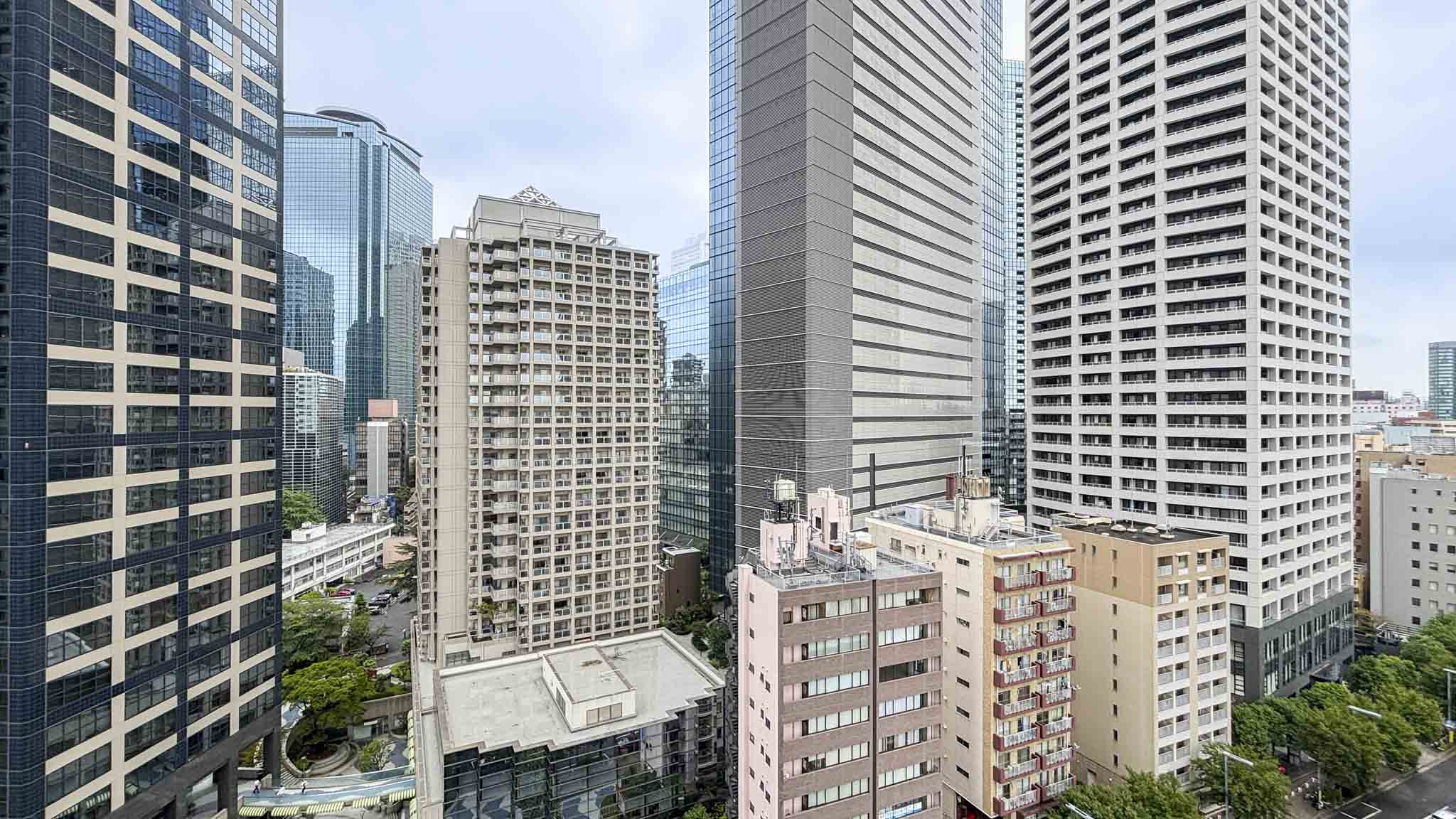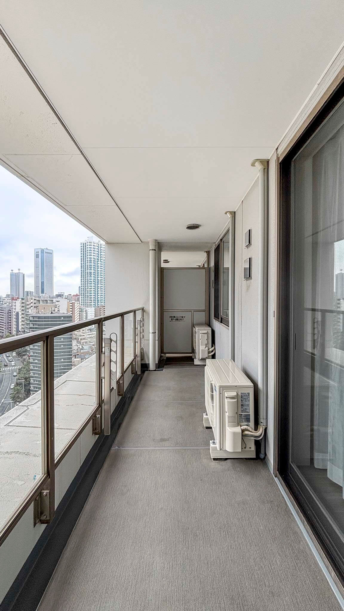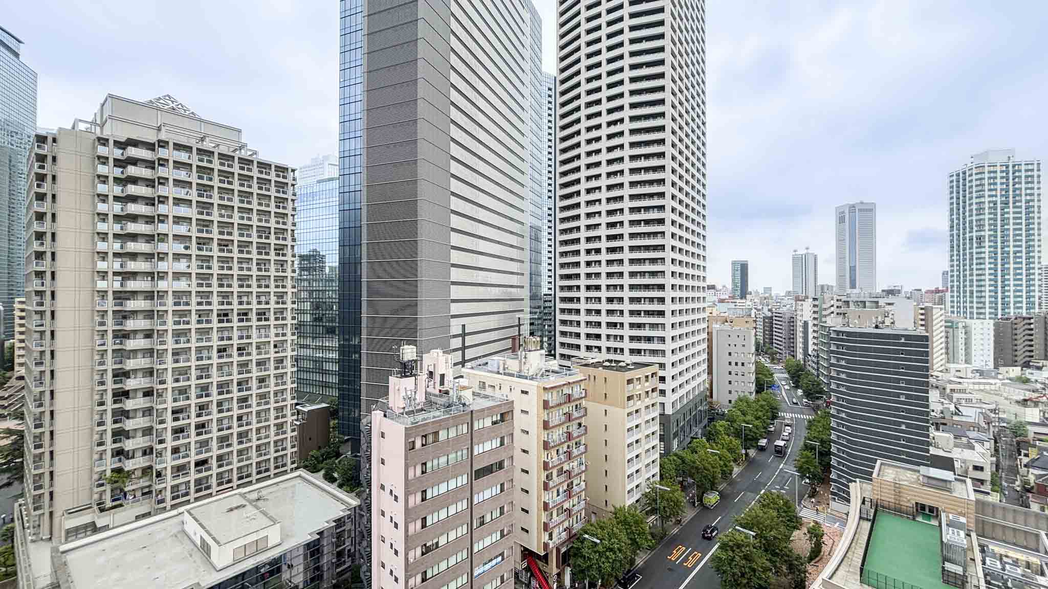 リビングダイニングと洋室1に跨るバルコニー。9.16㎡です。南東向きのため、晴れの日にはあたたかい太陽光が届きそうです。高層ビルが建ち並ぶ都心ならではの眺望に、街路樹の緑が彩りを添えています。