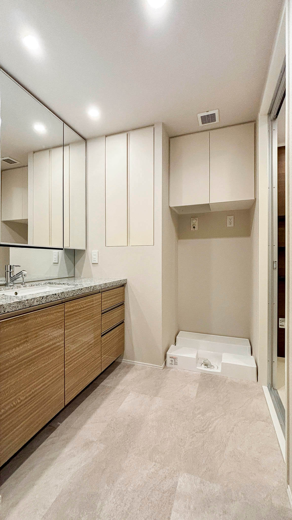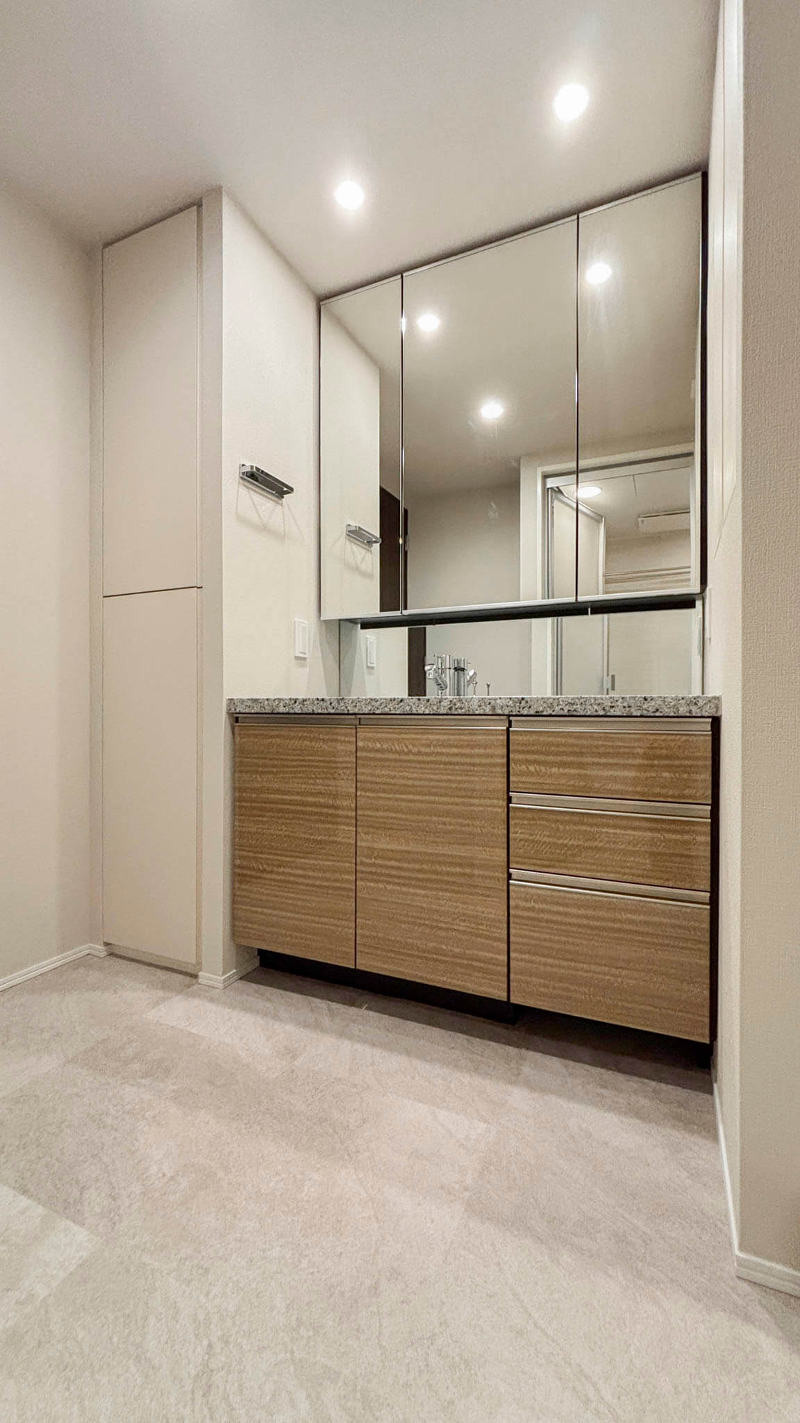 脱衣スペースを兼ねた洗面室には、大きな三面鏡付きの洗面化粧台を設置。広々とした石調カウンターが高級感を醸し出します。化粧品やドライヤーの仮置きができるスペースがあり、忙しい朝の身支度もスムーズに行えそうです。リネン庫完備で収納スペースも充実しています。
