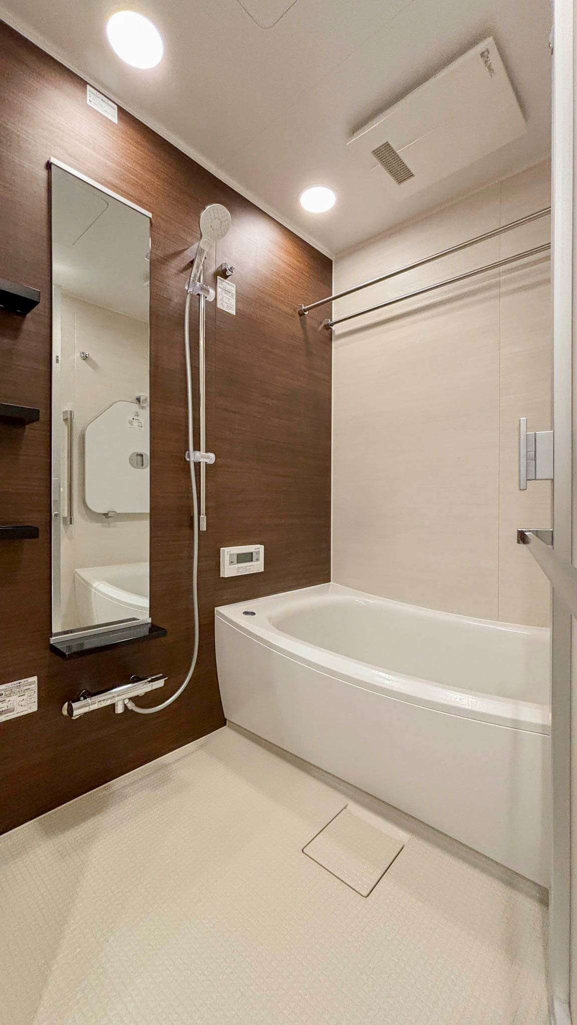 1416サイズのバスルーム。木目柄のアクセントパネルが落ち着く空間を演出します。浴室換気乾燥機・スライドシャワー水栓を完備しています。