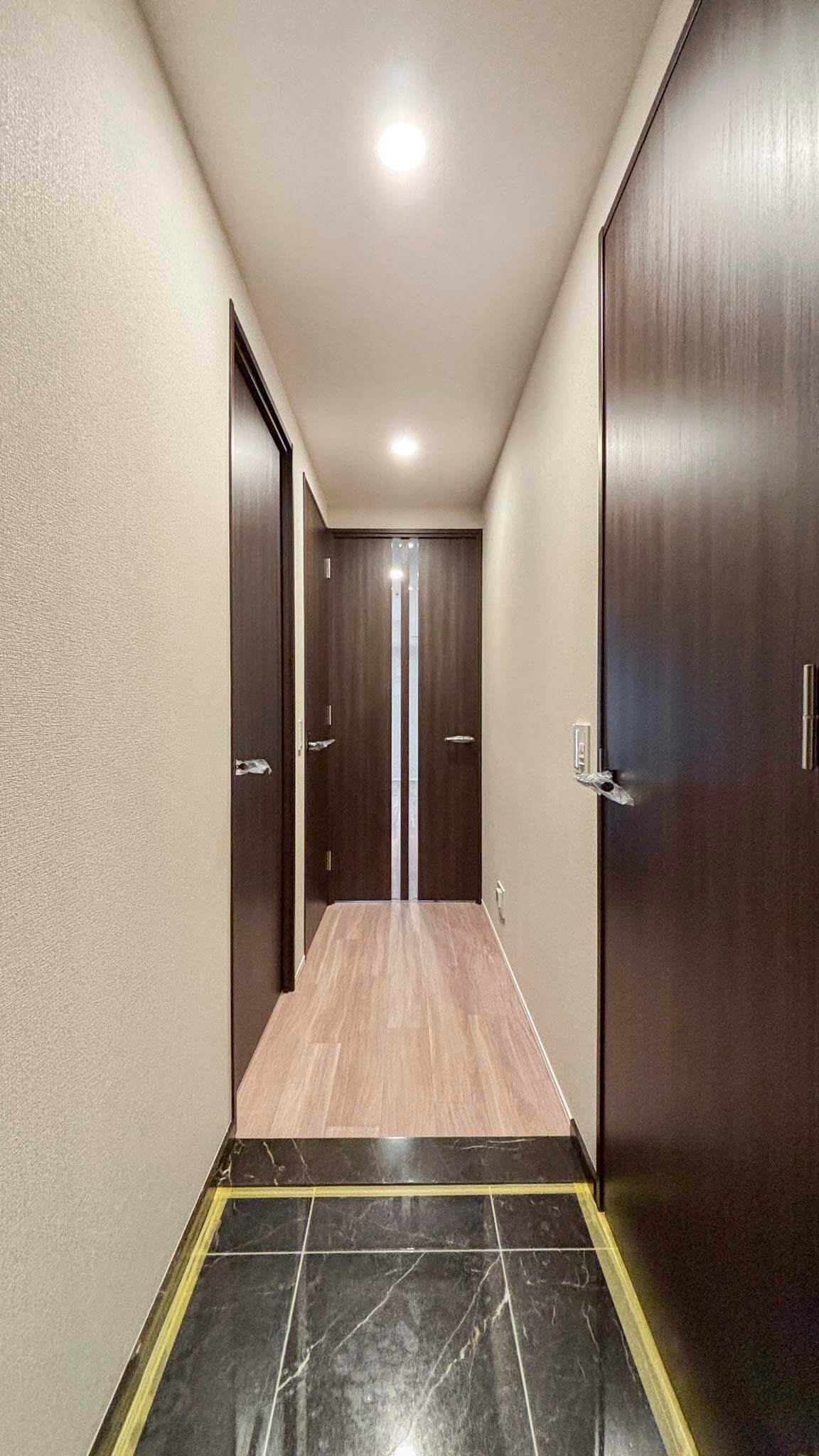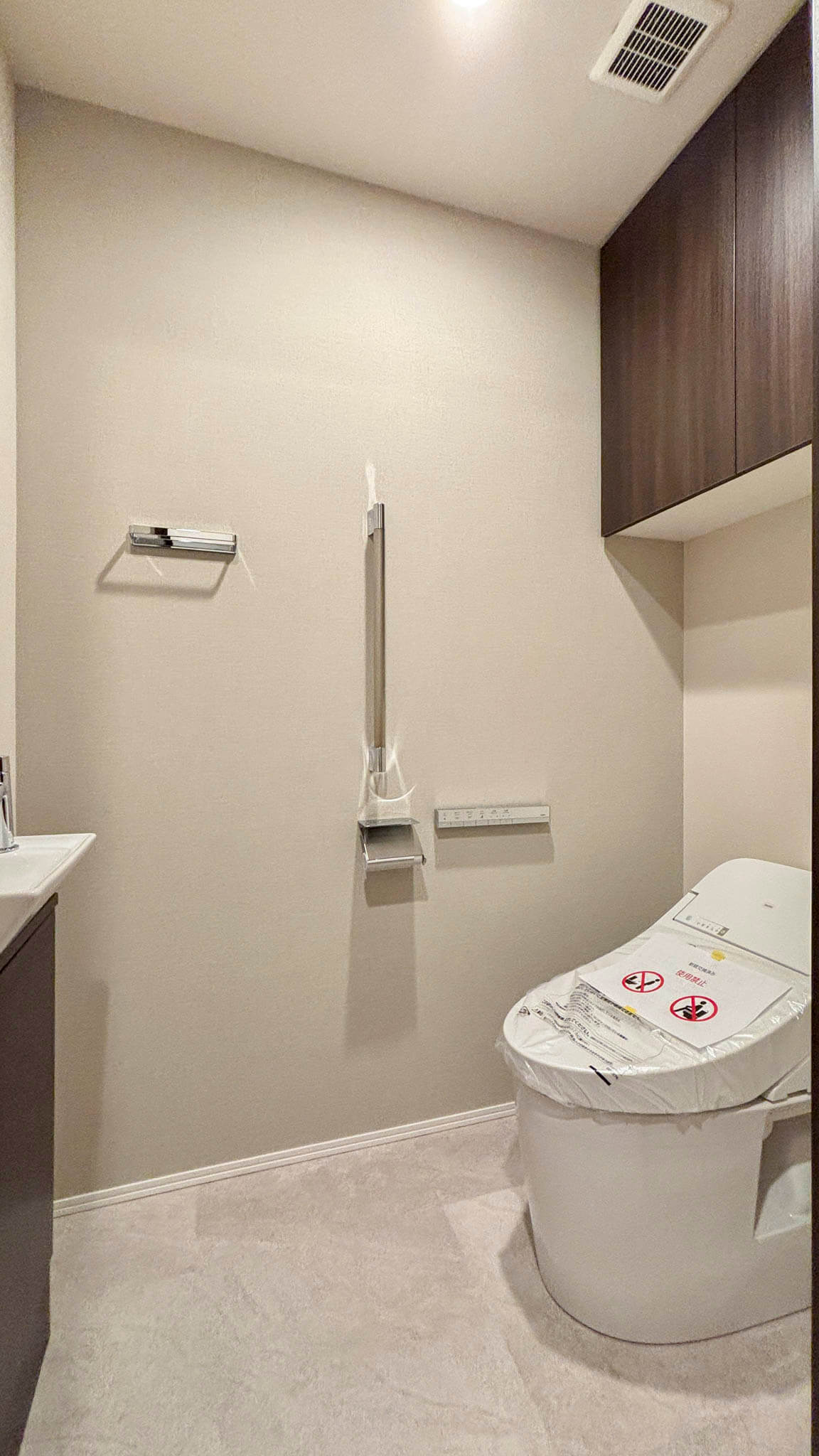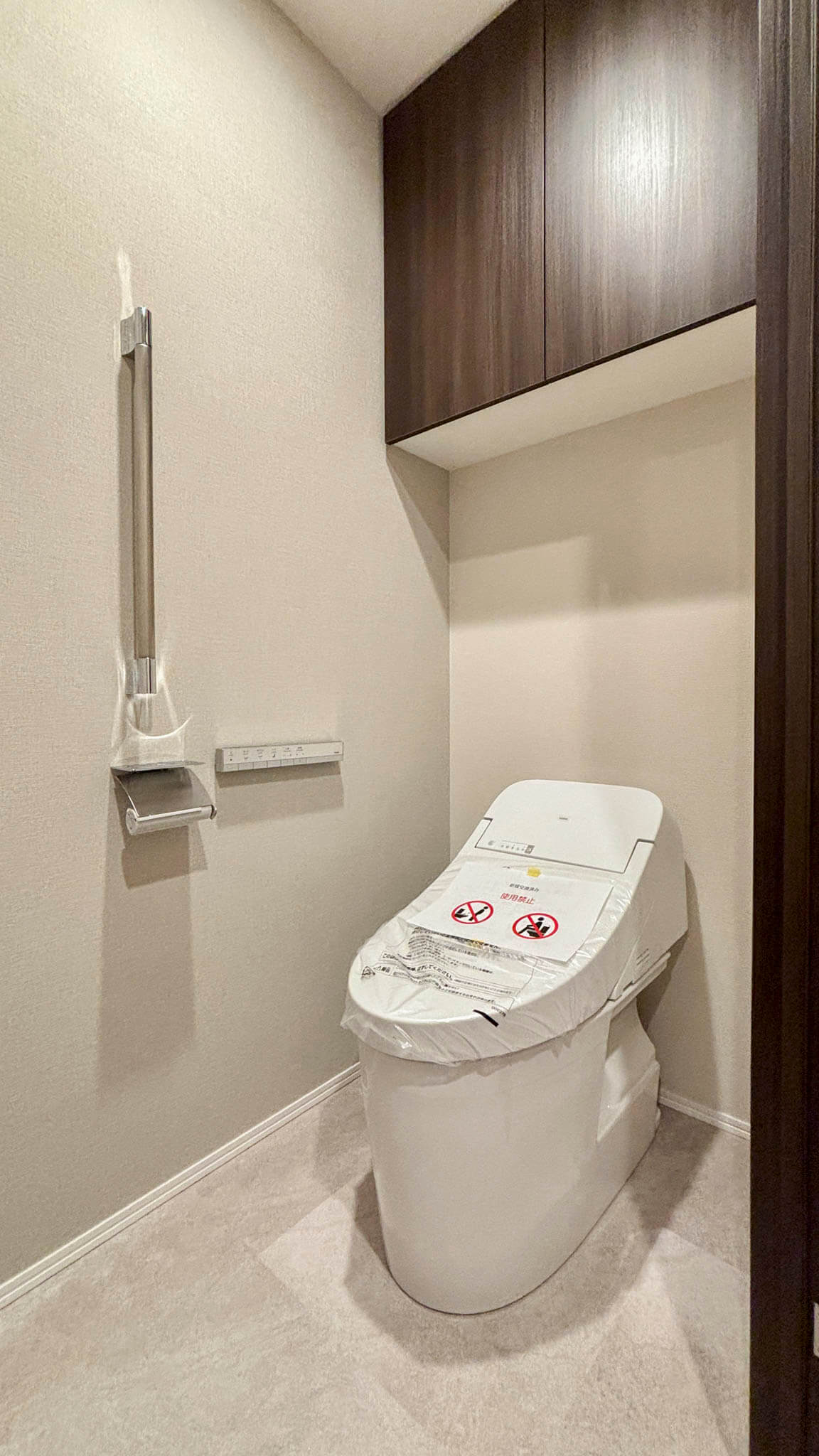 廊下に面していて独立性の高いレストルーム。スタイリッシュなタンクレストイレに交換済みです。正面に手洗いカウンターが設置されているので、すぐに手を洗うことができ、ゲストを洗面室まで案内する手間もかかりません。