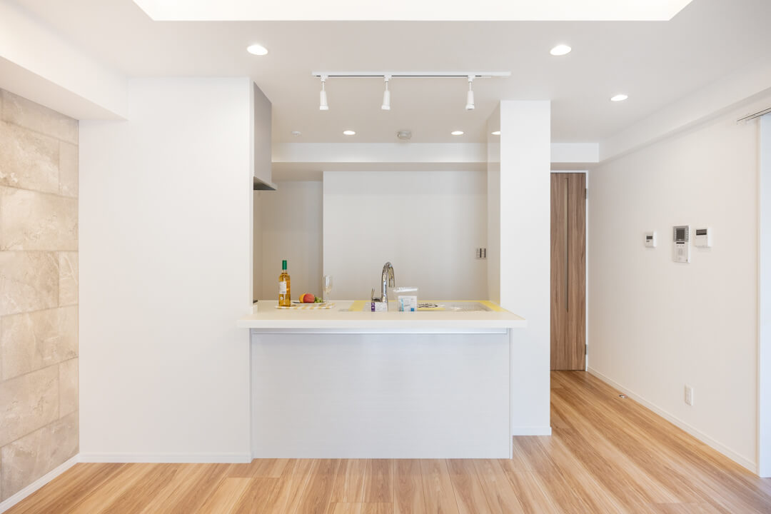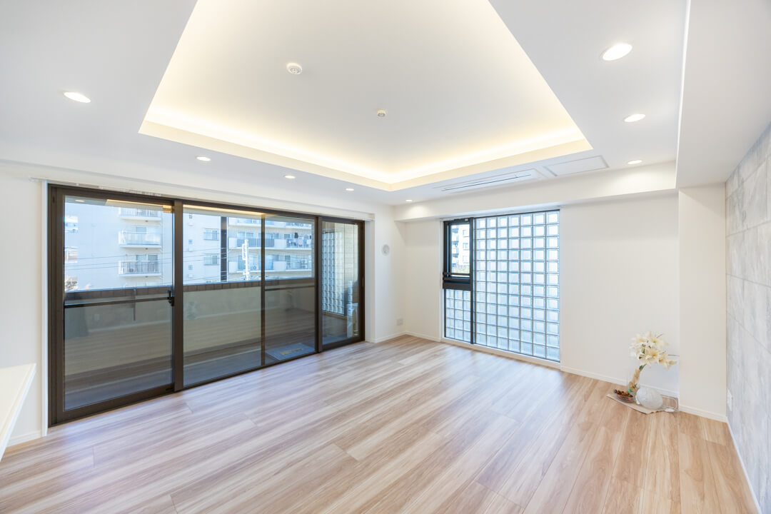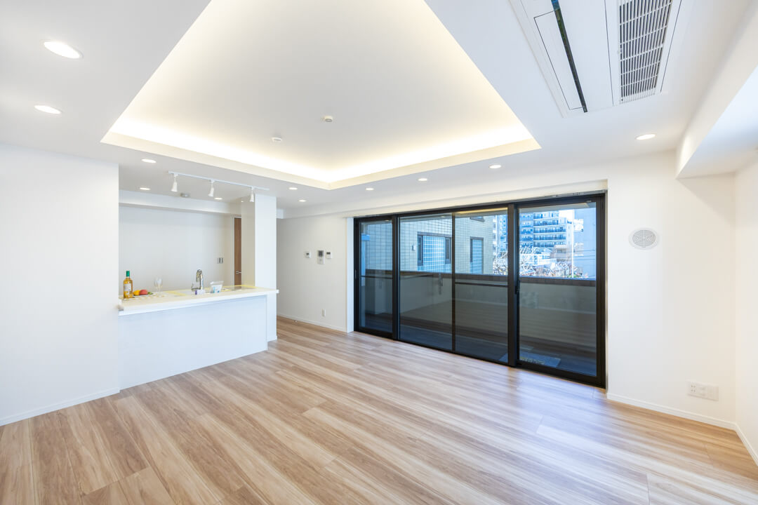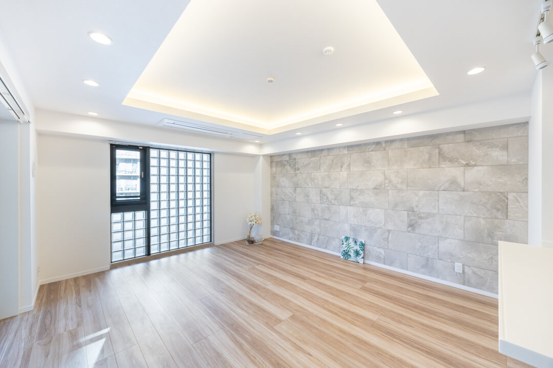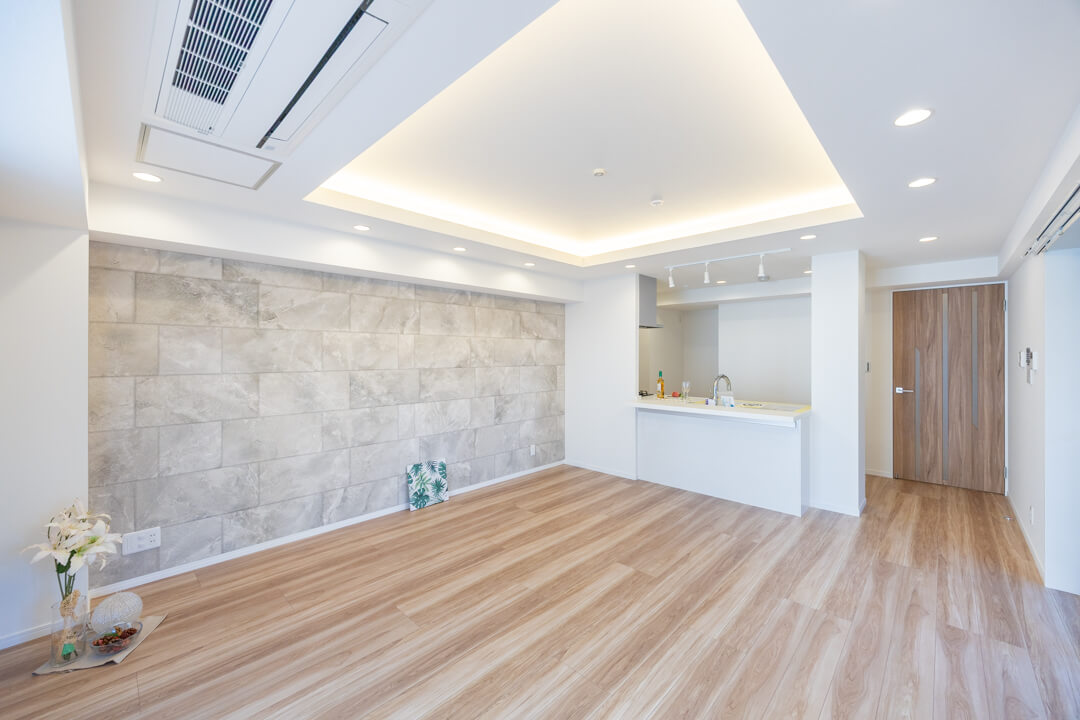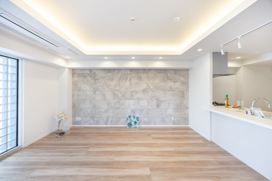 キッチンスペースを含め、約16.0帖のLDK。石目調のアクセントウォールが印象的で高級感のある雰囲気をプラスしてくれます。天井には間接照明が施されていて、空間をやさしく照らします。また、窓が大きく開放的、バルコニーも付いています。