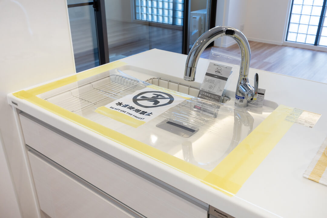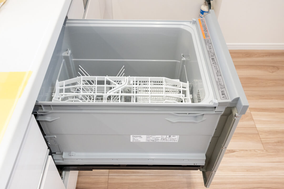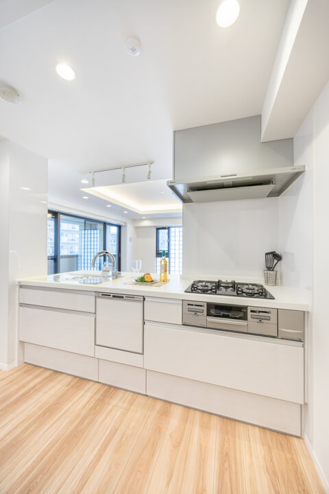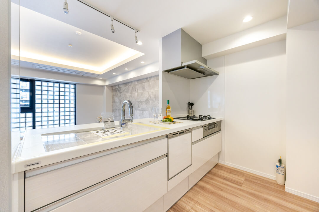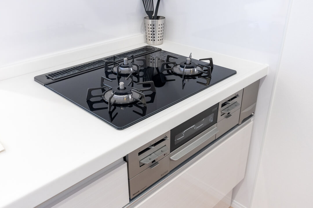 リビングダイニングが見渡せる対面型のシステムキッチン。家族やゲストと会話がしやすく、小さなお子さんがいるご家庭では子どもの姿も見守れます。料理が捗る3口ガスコンロ、家事の時短に心強い食洗機付きで設備も充実しています。