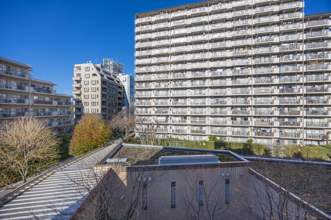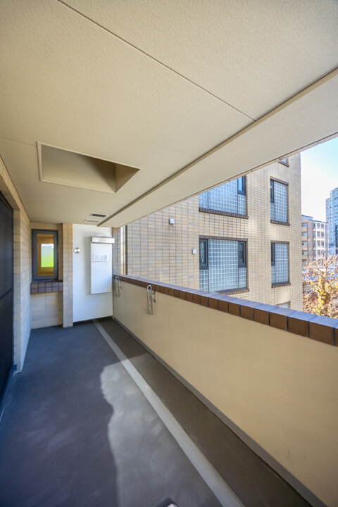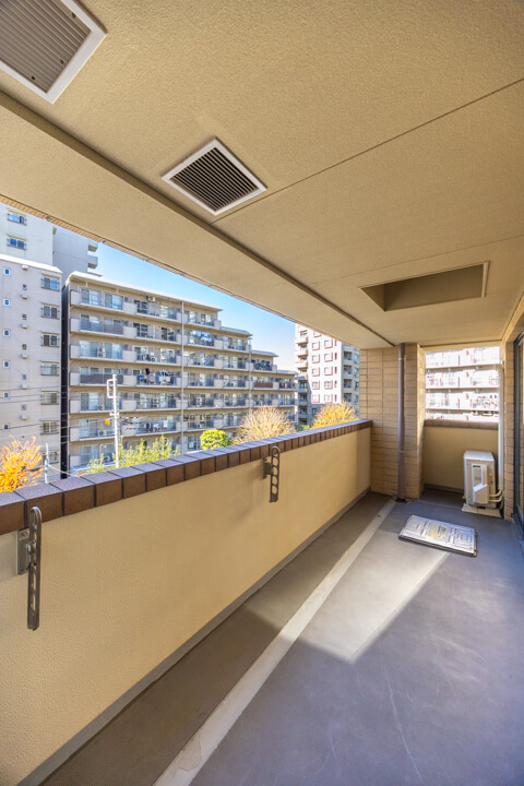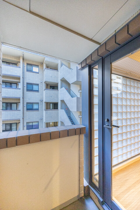リビングダイニングに面したバルコニー。夕方まで明るさの続く西向きです。目の前のマンションとは距離が保たれており、見晴らしも良好です。また、洋室(約6.6帖)側にもコンパクトなバルコニーが付いています。