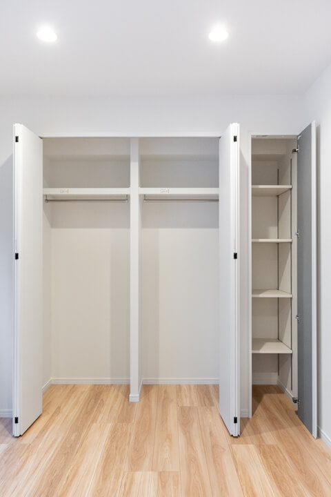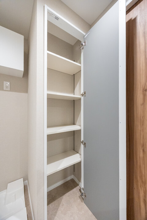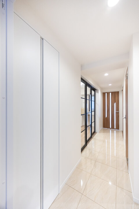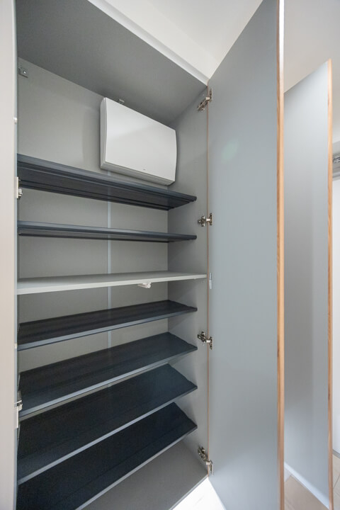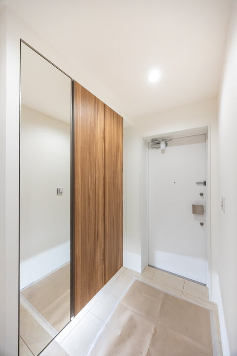 3枚扉のシューズボックスで靴がたっぷり収納可能。扉の一面が姿見になっていて、お出かけ前の身だしなみチェックもできます。廊下には物入、玄関外にはトランクルームが設けられていて、収納が充実しています。