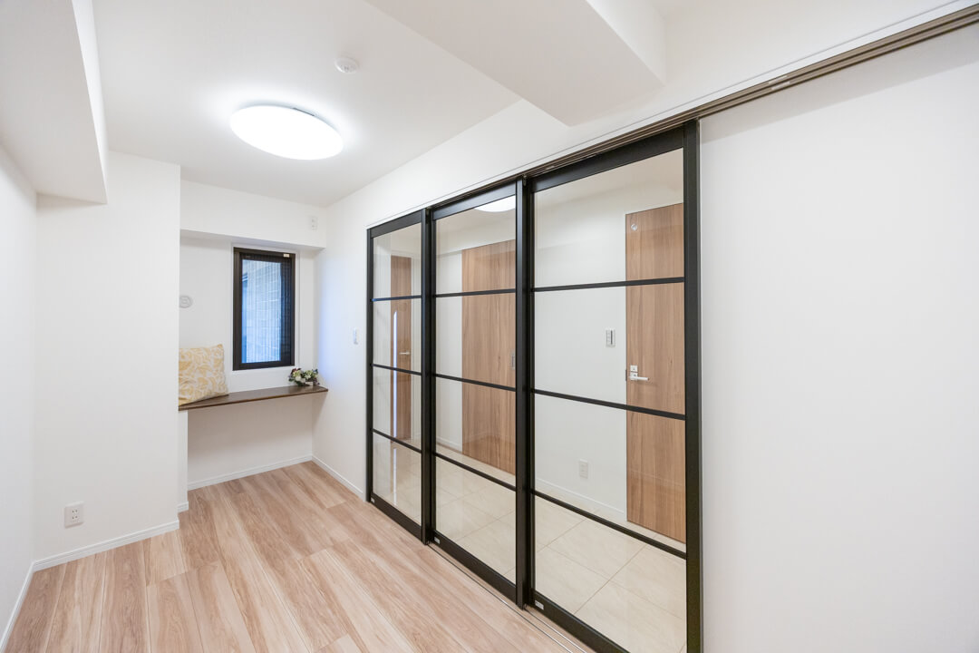 廊下に面した約4.6帖の洋室。ガラス戸でドアを閉めきった状態でも開放的。ワークスペースや趣味部屋としても使いやすいお部屋です。クローゼットも備わっています。