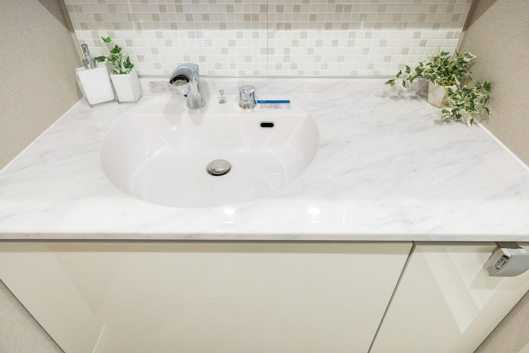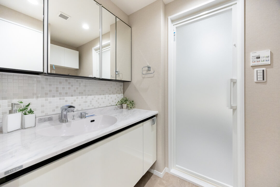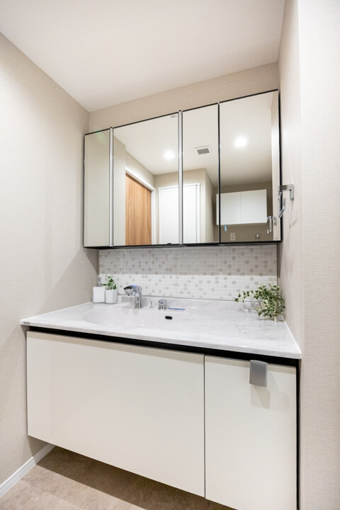 ゆとりのあるカウンタースペースで使い勝手のいい洗面化粧台。洗面まわりの小物がすっきり整頓できるミラーボックス付きでいつでも整った状態をキープできそう。別途、リネン庫も設けられています。