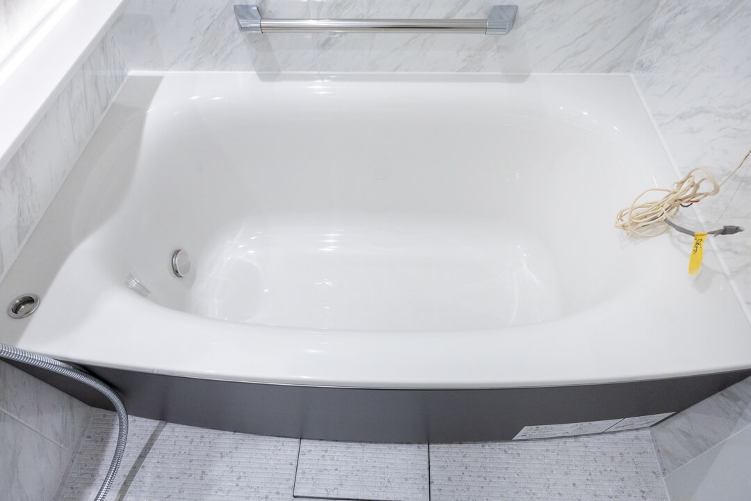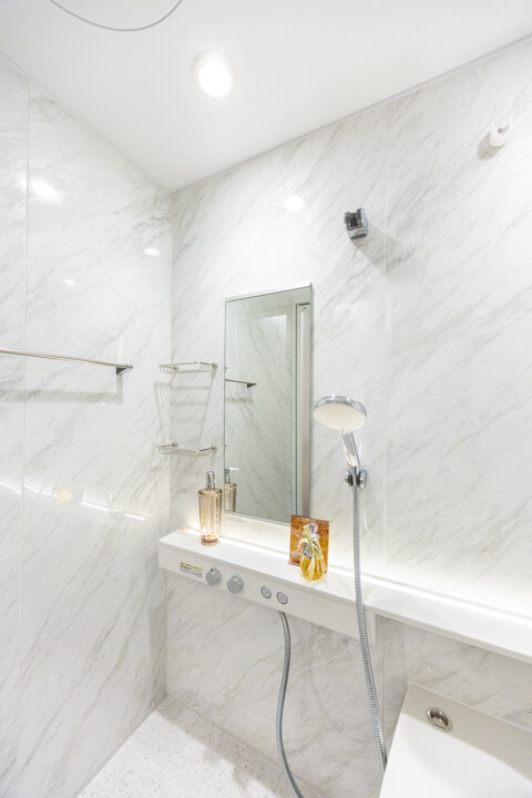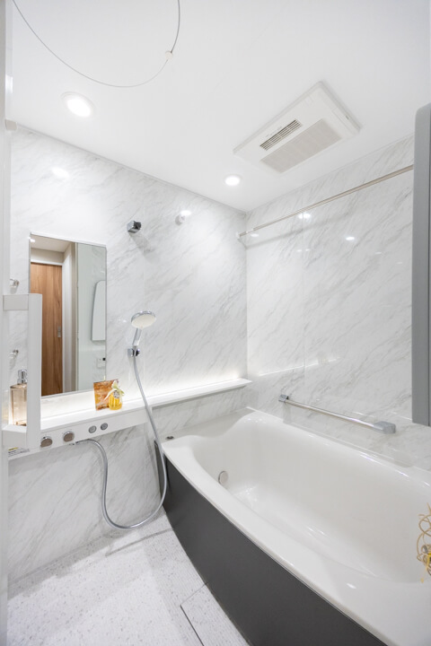 ストーン調で上品な雰囲気のバスルーム。追い炊き機能の他、乾燥・換気・暖房・涼風の4つの機能が備わっていて、一年中快適にバスタイムが楽しめます。ランドリーパイプも付いていて、雨の日や冬場の洗濯にも困りません。