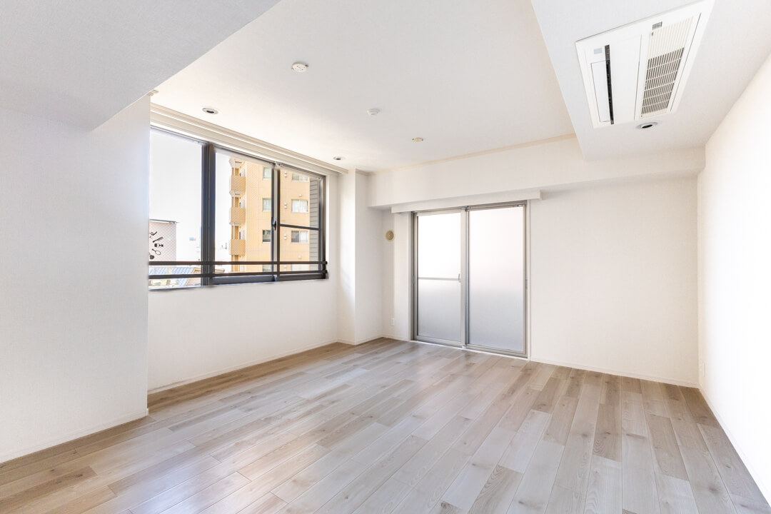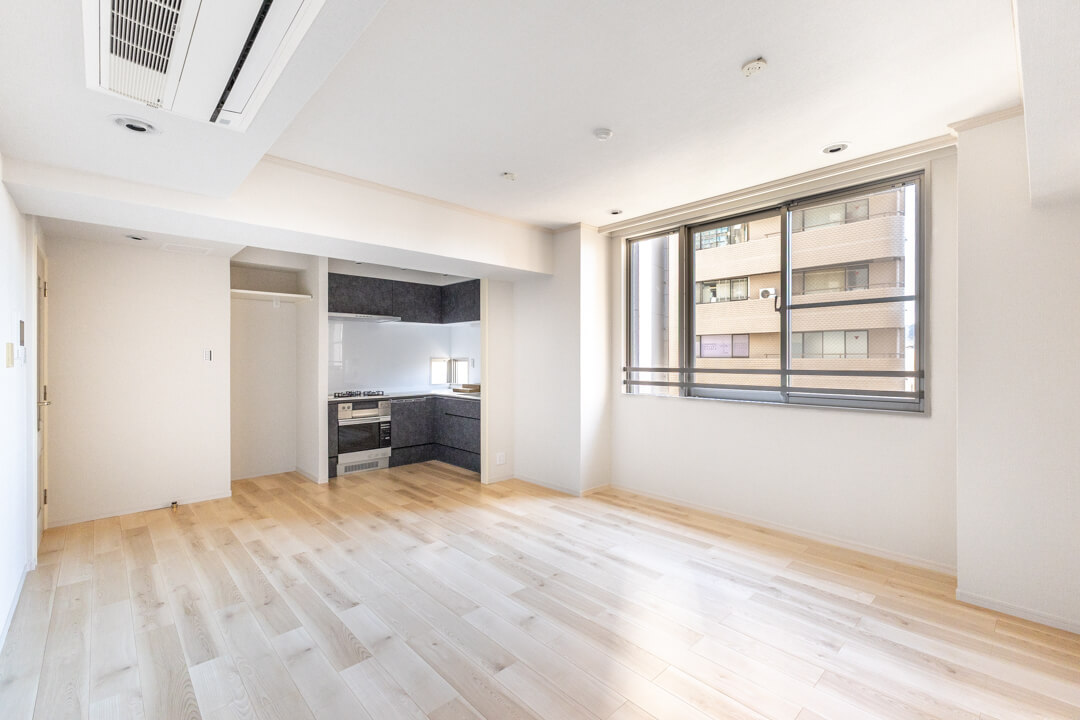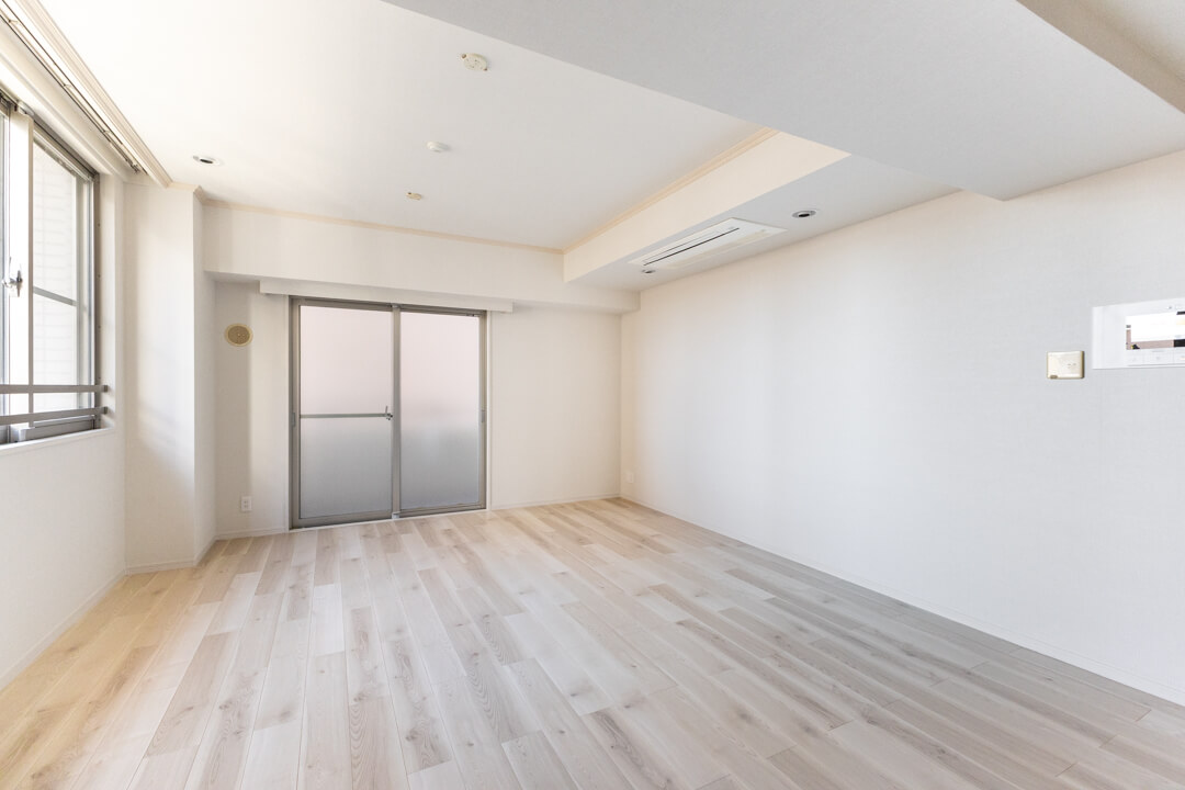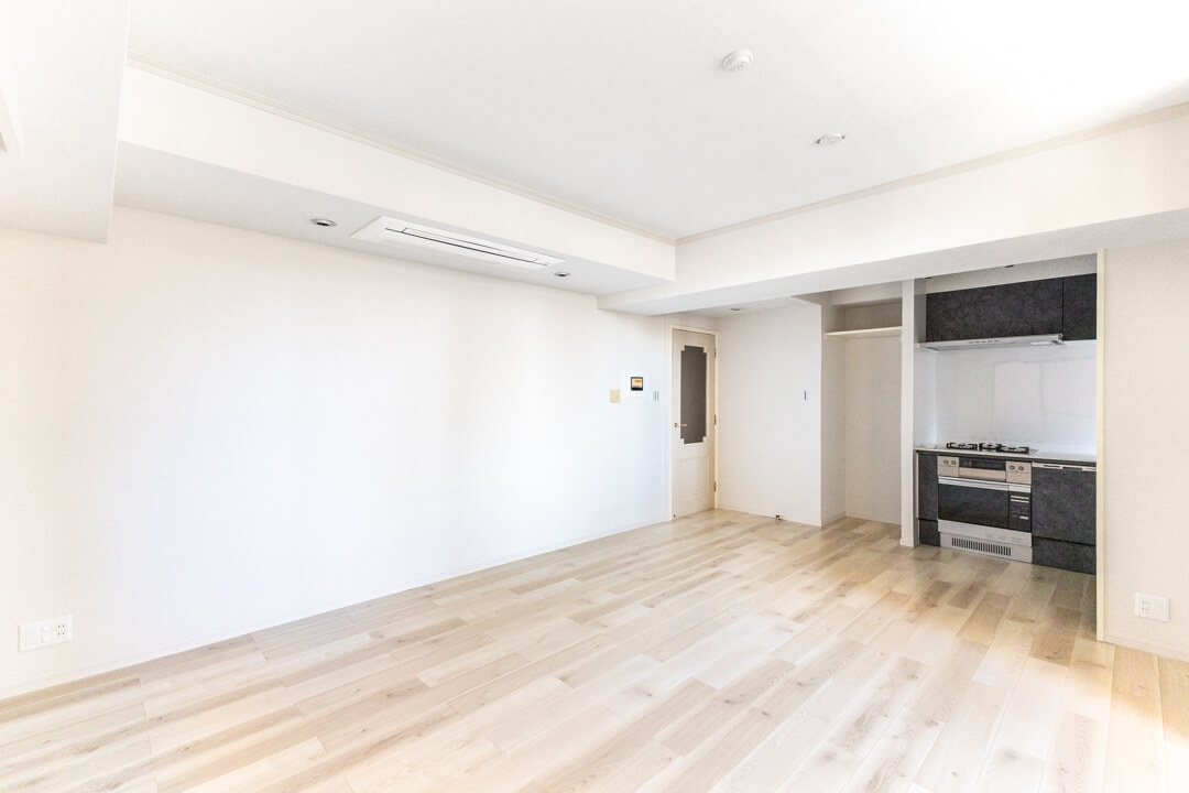 約14.8帖のLDK。南東2面採光で明るい自然光が届きます。朝日を浴びて午前中から活動的に過ごせそうですね。白い壁紙に木目のフローリングを採用した内装はインテリアを選ばず、家具選びの楽しみが広がりそう。奥行きをもたらすビルトインエアコン完備なのも嬉しいポイントです。