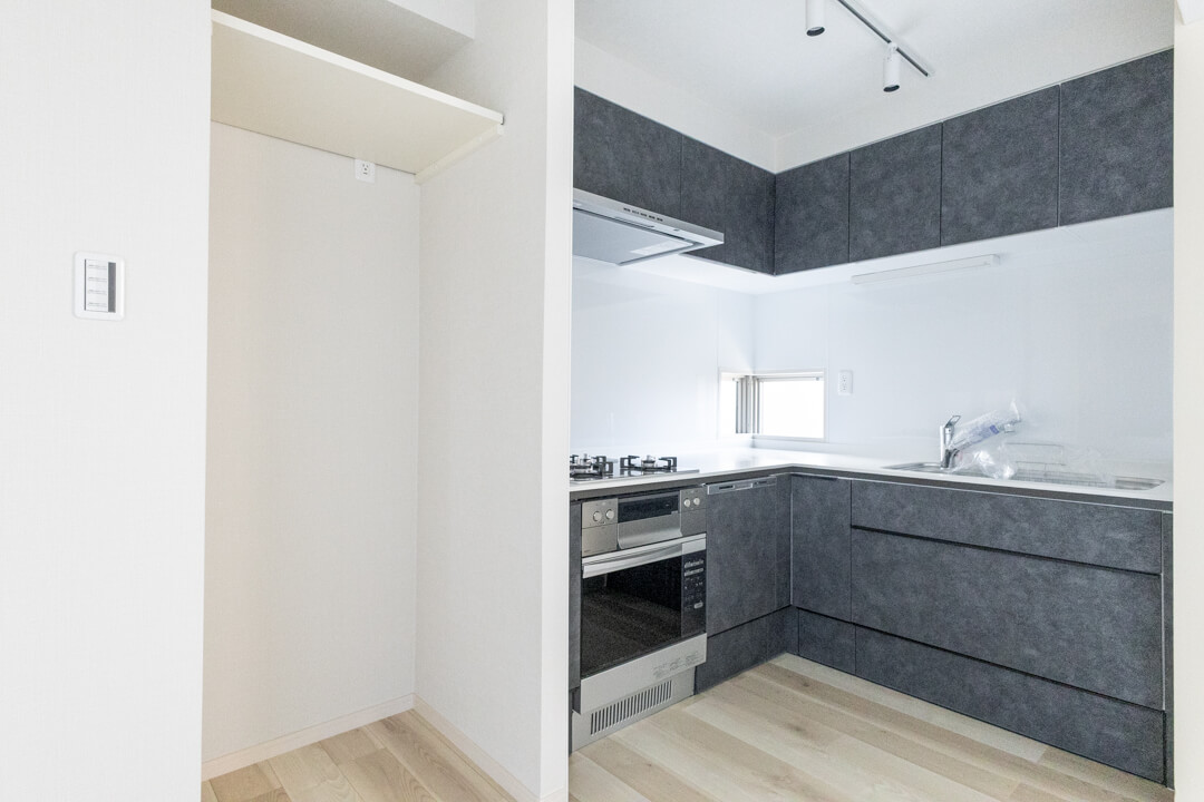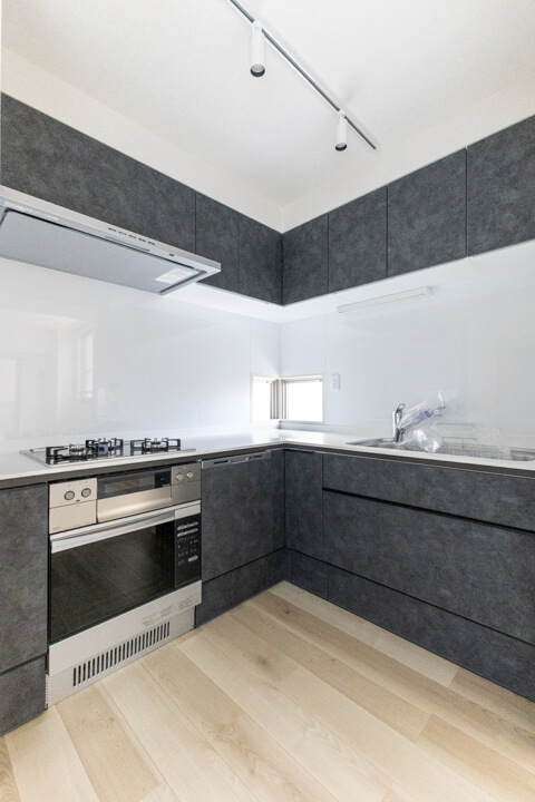 ブラックトーンでスタイリッシュなキッチン。キッチン内での動線が短いL型タイプで、効率良く作業ができます。複数人での調理も行いやすく、家族のコミュニケーションの場になりそうですね。