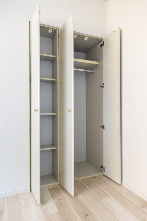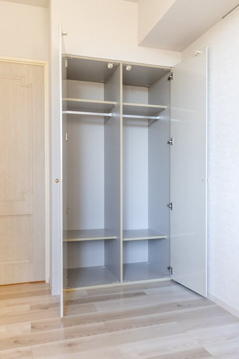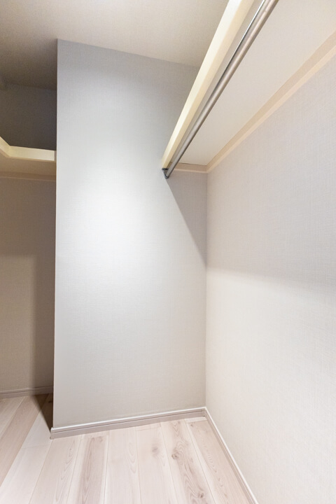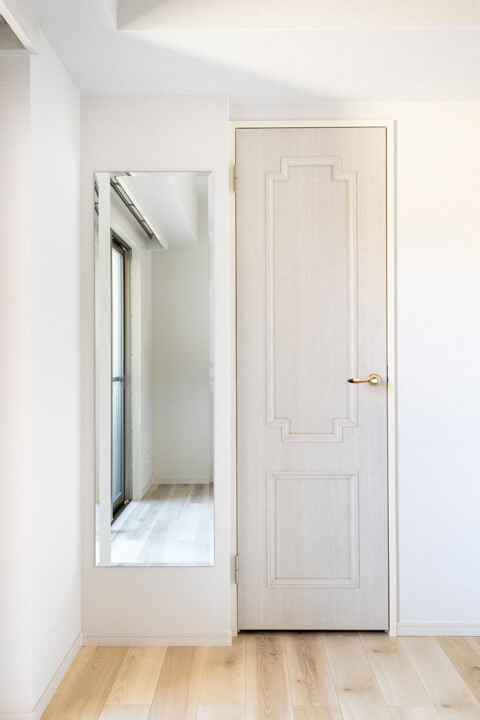 WIC(ウォークインクローゼット)完備で収納力◎。衣類はもちろん、トランクケースやゴルフバッグといった大きな荷物も収納でき、居室空間を有効活用できます。扉の隣に大きな鏡があり、コーディネートチェックに便利です。