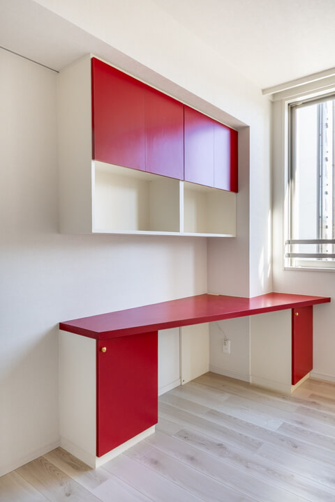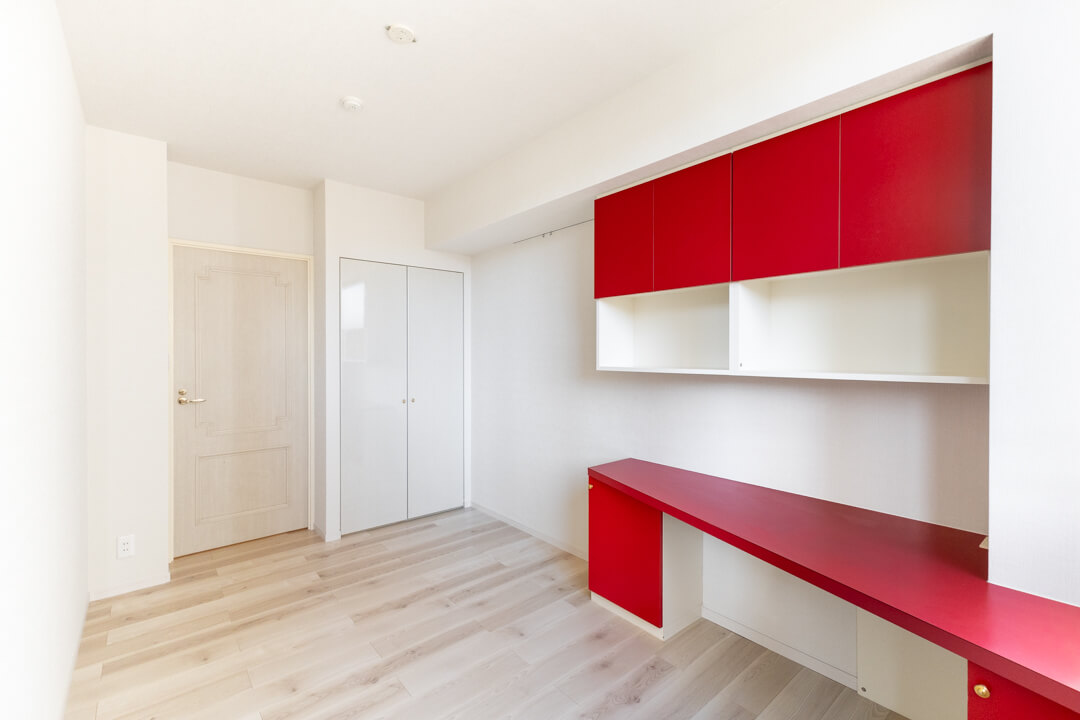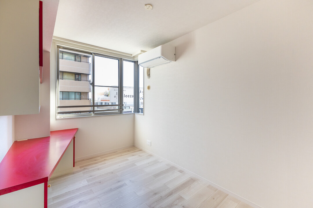 約6.0帖の寝室1。南東2面採光で、明るい光が届きます。午前中から活動的に過ごせそうですね。収納付きのテーブルはデスクとして使えて◎。お子さまの勉強や読書スペースとして活躍しそうです。既存品なので、自分好みのデザインに塗り替えても素敵ですね。
