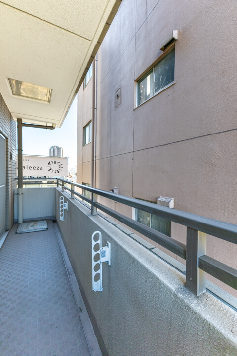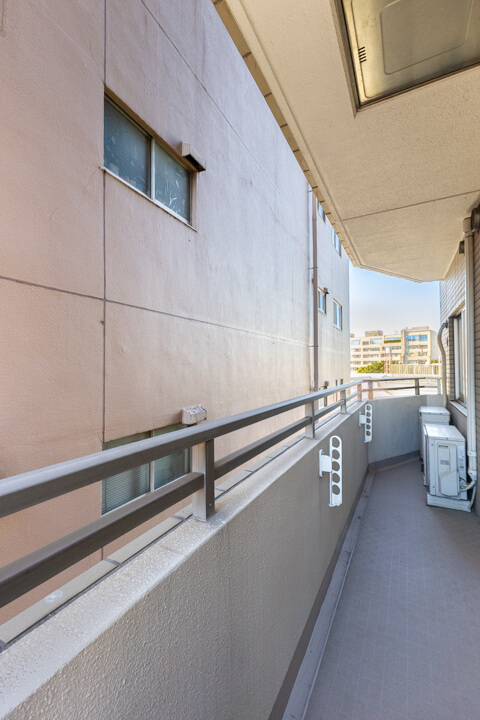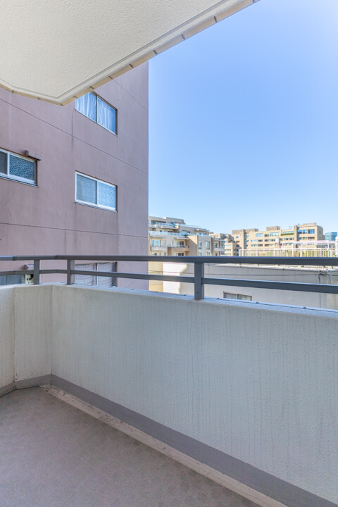 南東2面バルコニーで、室内に光と風を届けてくれます。LDKに面するバルコニーは南向き。正面には建物がありますが、東側は大通りに面していて、青空を見渡すことができます。
