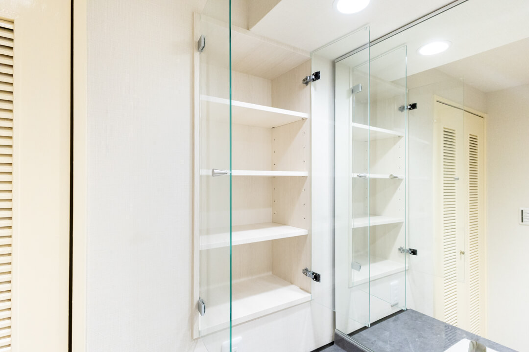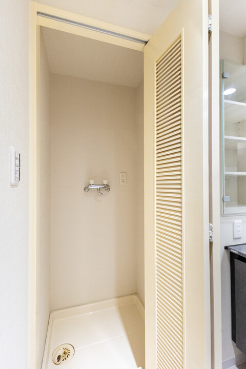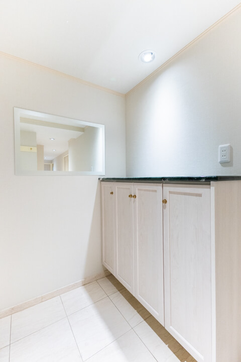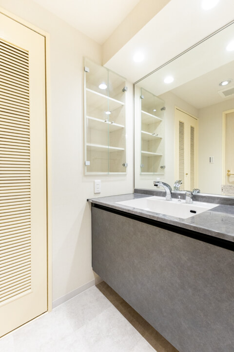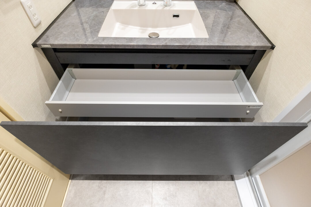 大きな鏡で高級感の漂う洗面化粧台。カウンタースペースにはゆとりがあり、化粧品やドライヤーの仮置きができます。忙しい朝の身支度もスムーズに行えそうですね。壁面収納や足元の引き出しなど、収納スペースも充実しています。