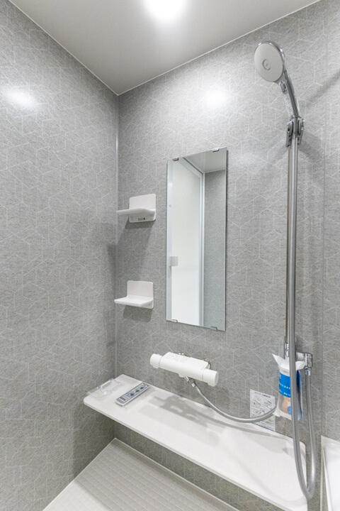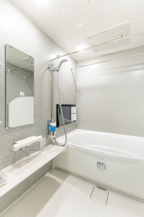 グレートーンでスタイリッシュなバスルーム。換気・暖房・乾燥・涼風機能付きで1年中快適なバスタイムをお過ごしいただけます。追い焚き機能も付いているので、家族の入浴時間がずれてしまった時、半身浴をしたい時に便利ですよ。TV付きなのも嬉しいポイントです。