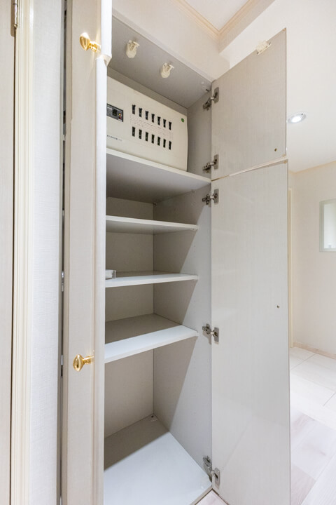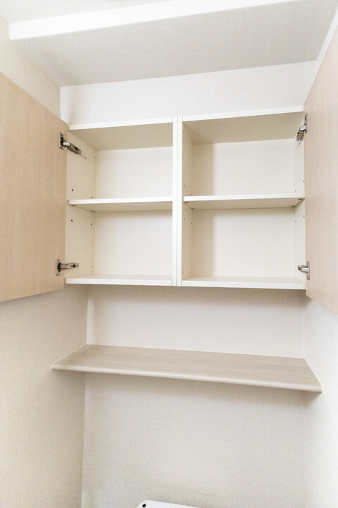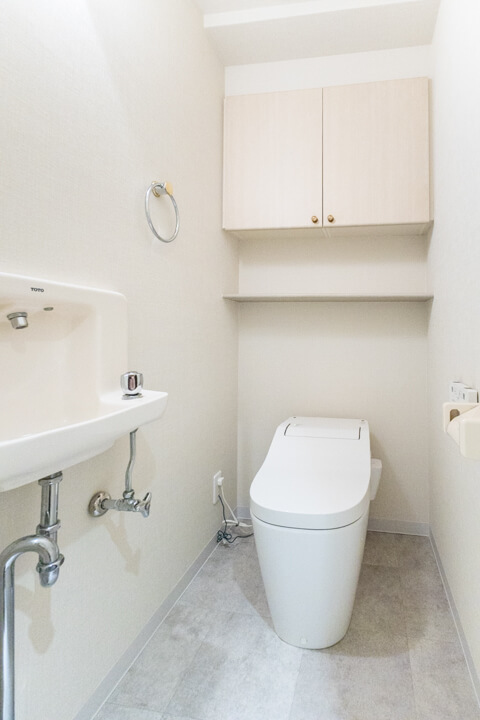 廊下に面していて独立性の高いレストルーム。Panasonic製の洗浄機能付トイレを採用しています。タンクレス仕様ですっきりとした印象ですね。手洗い器が設置されているのですぐに手を洗うことができ、ゲストを洗面室まで案内する手間もかかりません。トイレットペーパーや掃除用品を収納できる吊戸棚も完備されています。