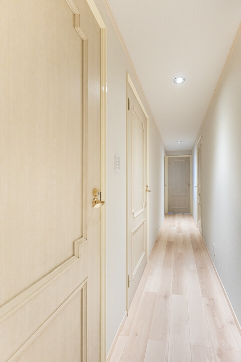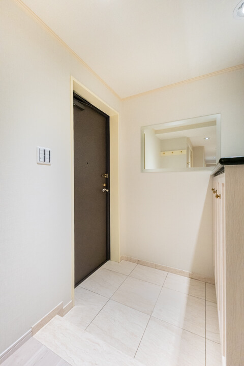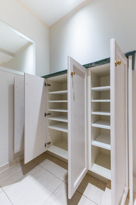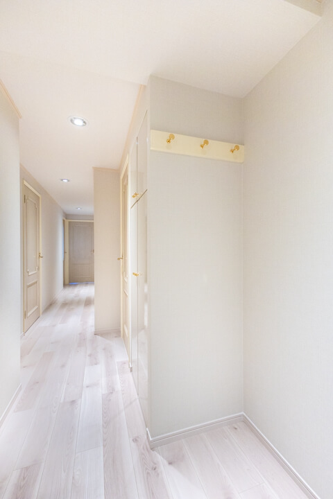 明るい内装で清潔感のある玄関スペース。散らかりがちな靴はシューズボックスにすっきり収納できます。カウンターにお花や小物を飾り、華やかにお出迎えできますね。コートフックが備え付けなのも嬉しいポイント。廊下にも物入があり、日用品ストックやペットグッズの収納に重宝しそうです。