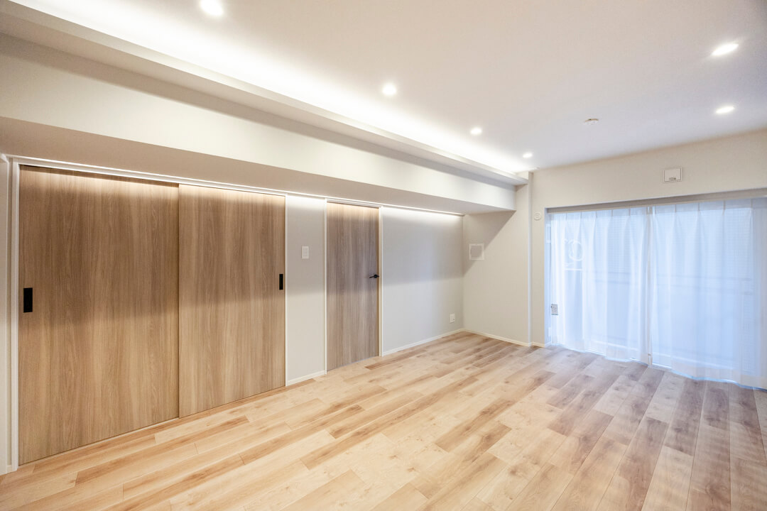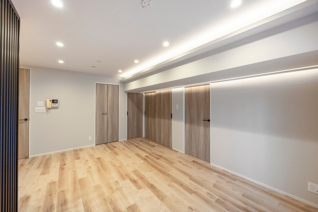 約15.1帖の広々としたリビングダイニングキッチンです。天井には間接照明があしらわれて、上品さをプラスしてくれています。また、フローリングはナチュラルな風合いで美しい木目柄。どんな家具ともマッチしそうで◎。