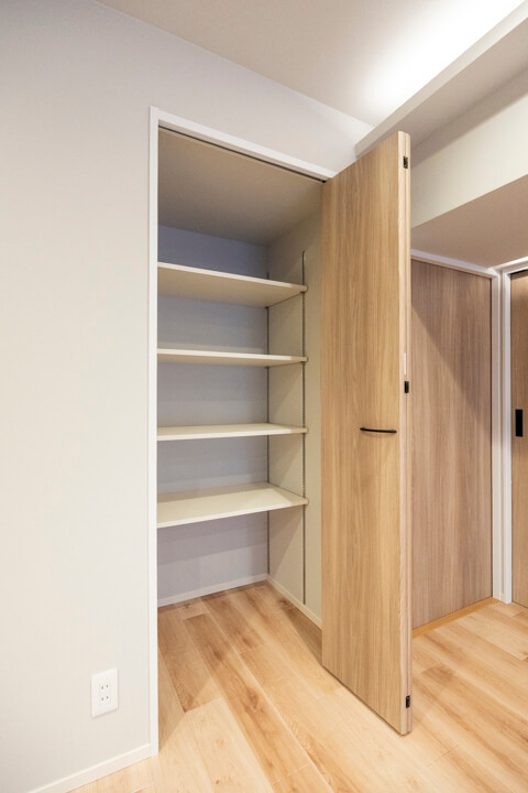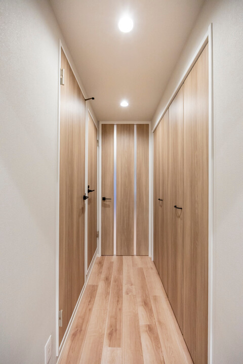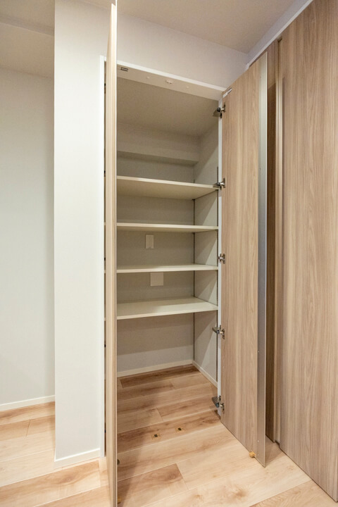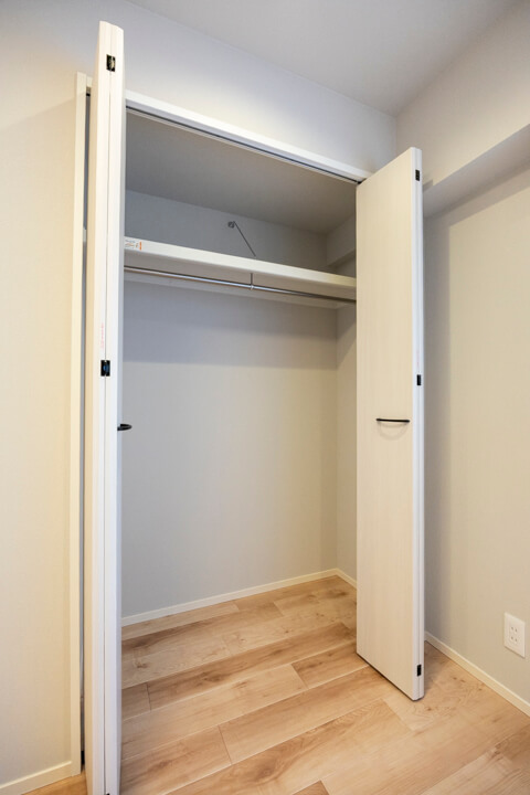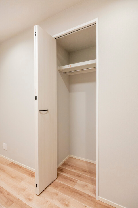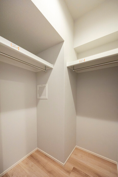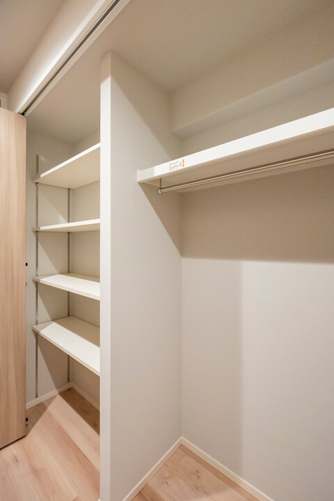 廊下には可動棚やパイプハンガーが設置されているクローゼットが造られています。荷物をきちんと収納できると、居住スペースをより有効的に使うことができるので嬉しいですね。