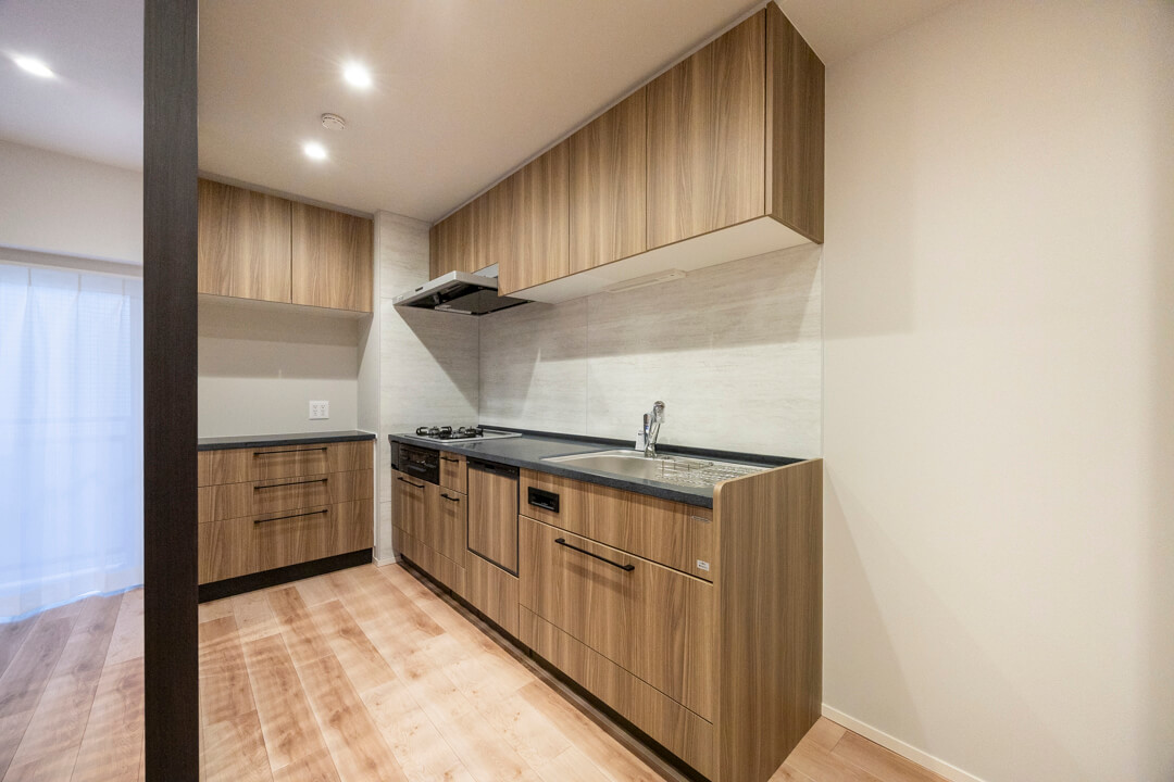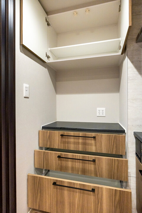奥にはカップボードが備え付けられています。調味料や食器などを収納できるだけでなく、電子レンジなどを置くこともできるので便利です。