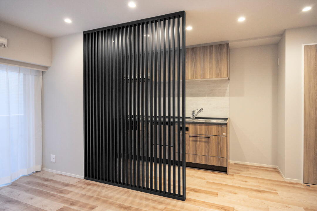 ブラックの格子でさりげなく空間分けがされているキッチンです。視線はやわらかく遮りつつ、光や空間の抜け感は確保できて◎。