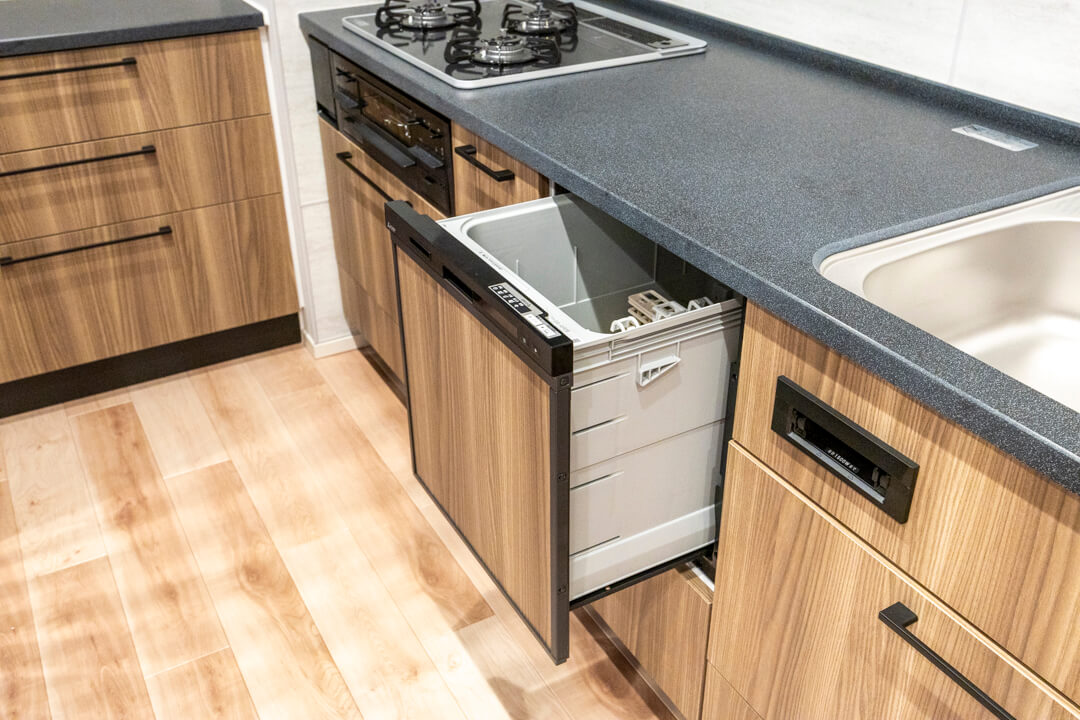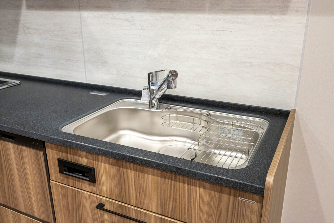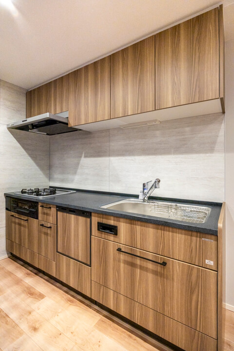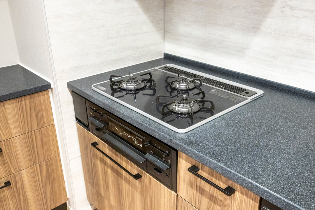 2400サイズの大型キッチンは、3口コンロ、グリル、食洗機付きと設備面も充実しています。シンクも広々としているので野菜などが洗いやすそうですよ。