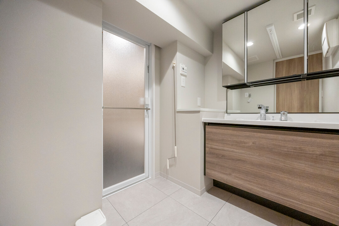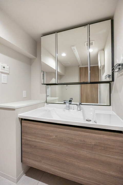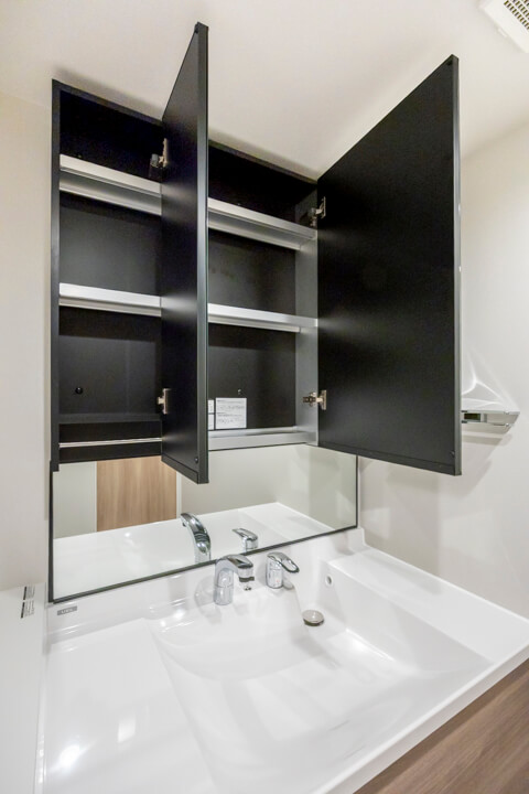 洗面化粧台は、ブラックフレームがアクセントになっていてデザイン性が◎。三面鏡は中に化粧品などの小物が収納できるようになっているので使い勝手良好です。照明が縦に配置されており、顔に影をつくらないのも嬉しいポイント。また、洗面ボウルとカウンターが一体型になっているのでお掃除が簡単です。