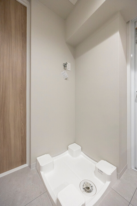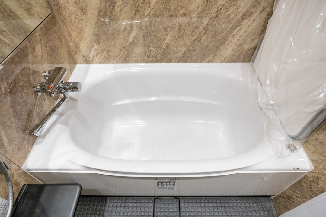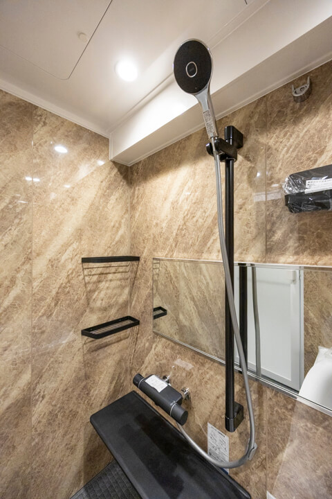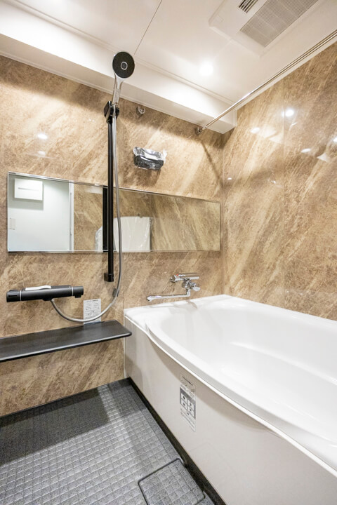 ストーン調の壁パネルが重厚感をもたらしているバスルームです。お湯が冷めにくい保温浴槽なので、入浴時間に差があっても安心です。また、浴室乾燥機が搭載されており、暖房・乾燥・換気・涼風の機能がついているので、一年中快適に過ごすことができます。シャンプーなどが置ける収納棚は2段も設置されていますよ。