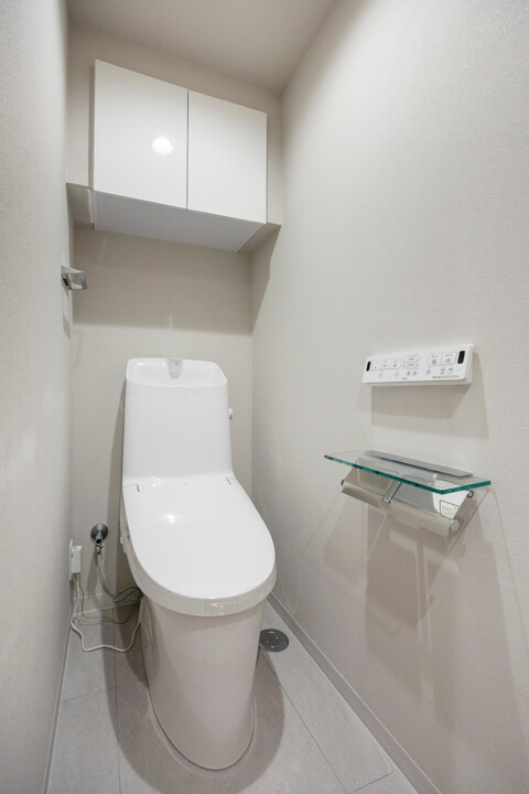 ウォシュレット一体型のトイレです。上部には吊戸棚が設置されているので、トイレットペーパーや掃除用具などを収納することができます。