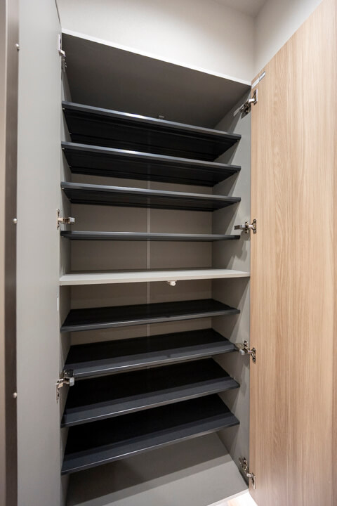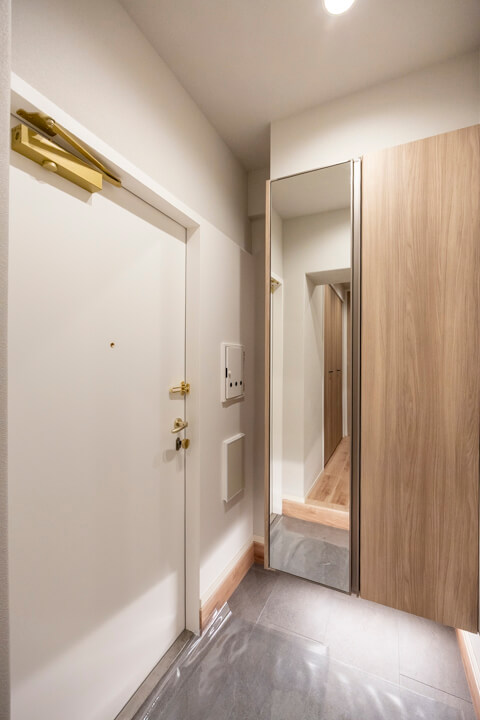 玄関入って左側にはシューズボックスが備え付けられています。フロートタイプのため空間に圧迫感を与えず、フットライトの光が優しく足元を照らしてくれますよ。また、扉面には鏡が設置されているので、出かける際に全身のコーディネートをチェックすることができます。