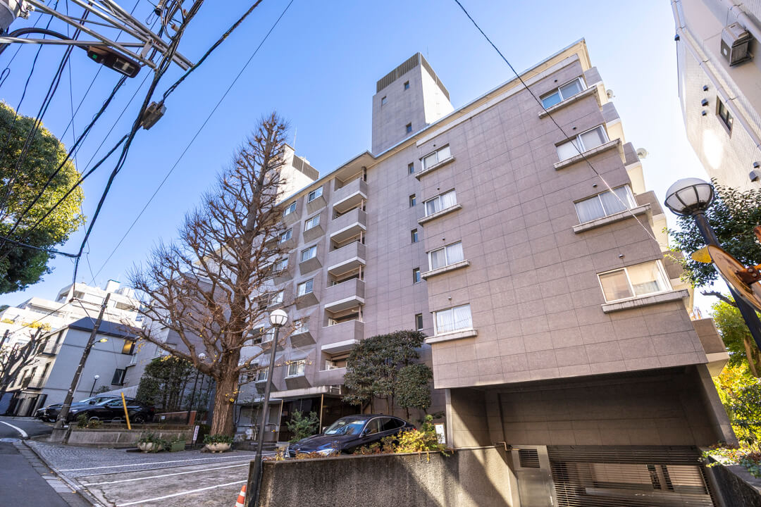 1971年(昭和46年)8月竣工、総戸数50戸、鉄骨鉄筋コンクリート造、地下1階付7階建てのヴィンテージマンションです。綺麗に整えられている植栽が印象的でエントランスは温かみのある雰囲気。オートロック付きでセキュリティ面は安心。共用廊下は内廊下設計になっているのでプライバシーに配慮しているだけでなく、雨の日にも嬉しい設計です。