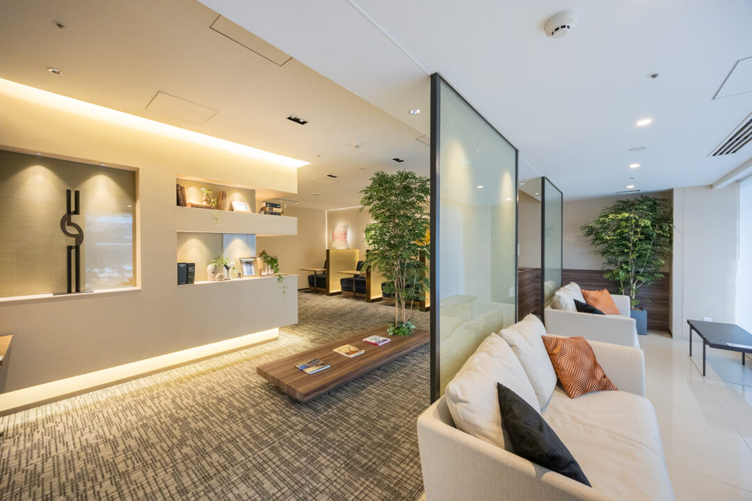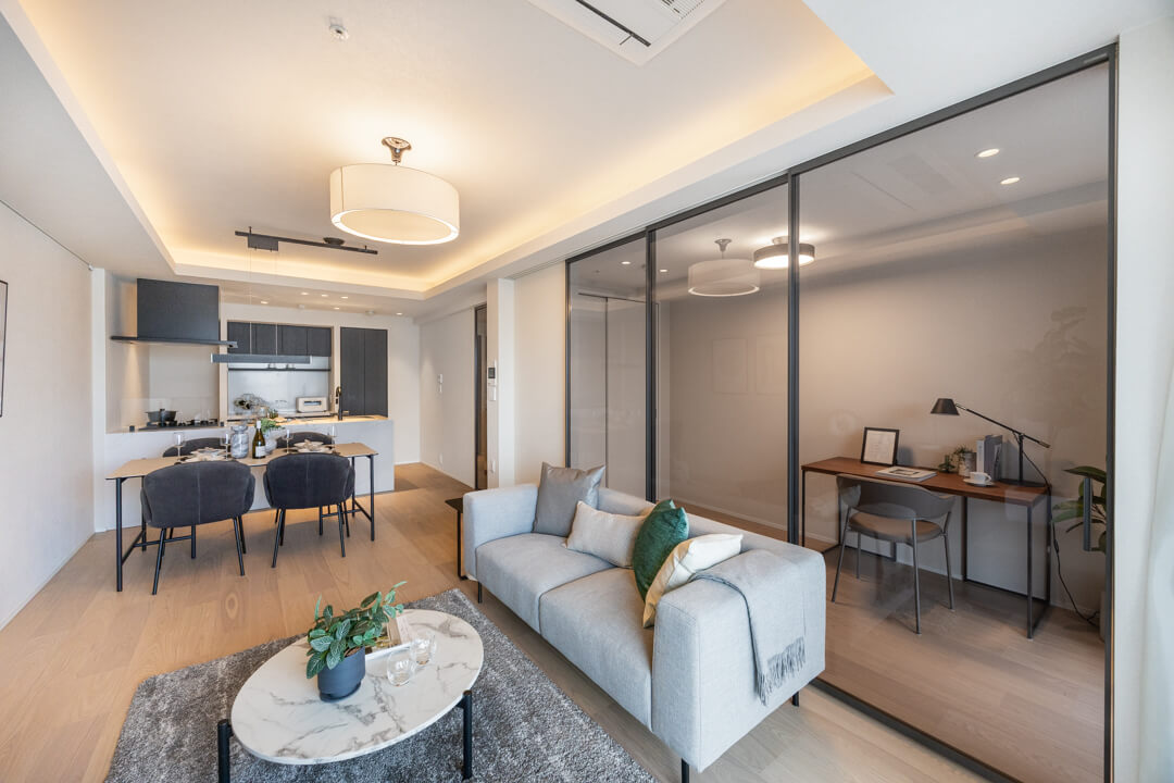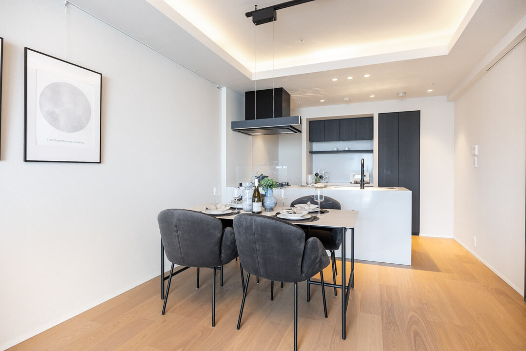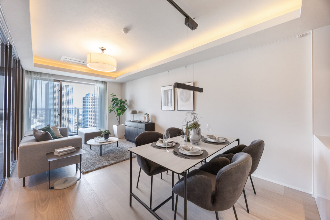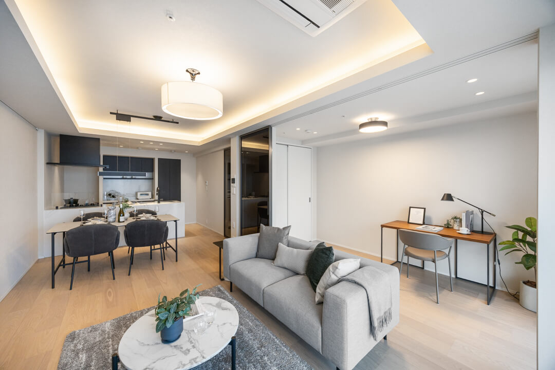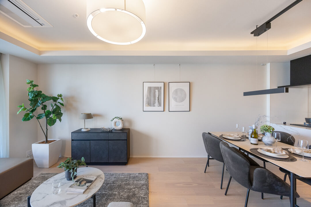 約16.5帖の広々としたLDK。東向きの大きな窓から心地よい自然光が降り注ぎます。折り上げ天井&ビルトインエアコンを採用し、空間に奥行きを。間接照明のグラデーションが上質でスタイリッシュな雰囲気を演出します。