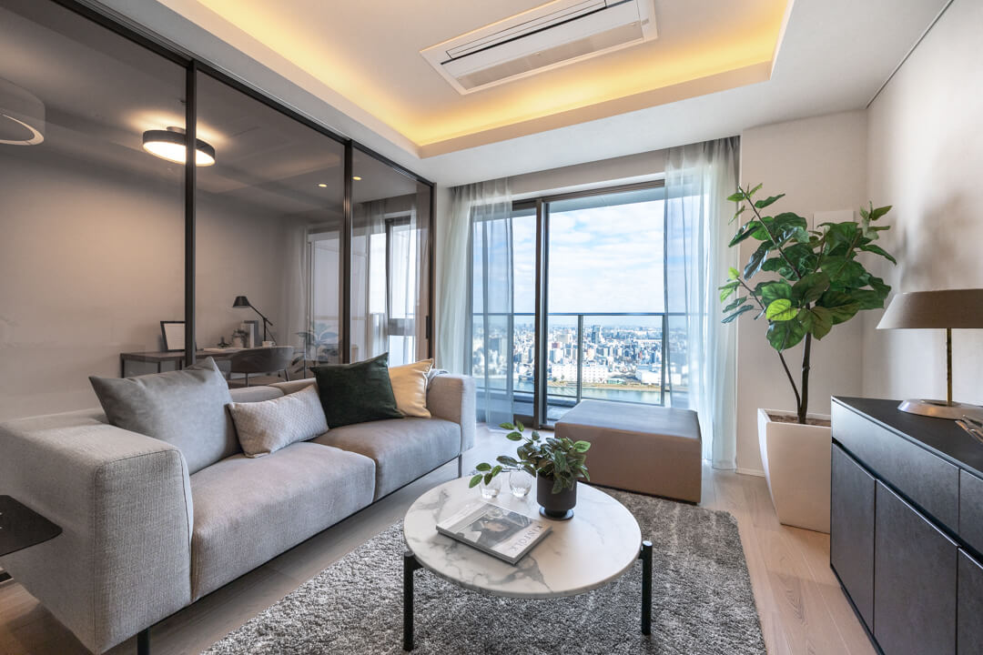 地下1階付地上35階建、総戸数416戸の免震構造タワーレジデンス。モニター付オートロックや24時間有人管理体制など、安心の暮らしを支える設備が整っています。リバービューラウンジやスタディカフェ、キッズルームといった共用施設も充実していて、1階にはスーパーが入っているのも嬉しいポイント。今回ご紹介するお部屋は33階部分、専有面積77㎡の3LDKです。約16.5帖のLDKは東向きの大きな窓から自然光が入り、折り上げ天井と間接照明が上質な雰囲気を演出します。全居室に面したワイドバルコニーからは、晴海運河や東京スカイツリーを望む開放的な眺望も楽しめますよ。水辺と都心の利便性を併せ持つ、落ち着いた住まいです。