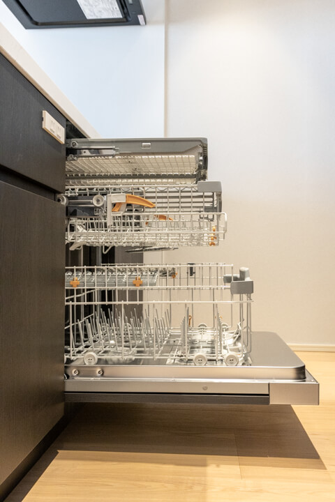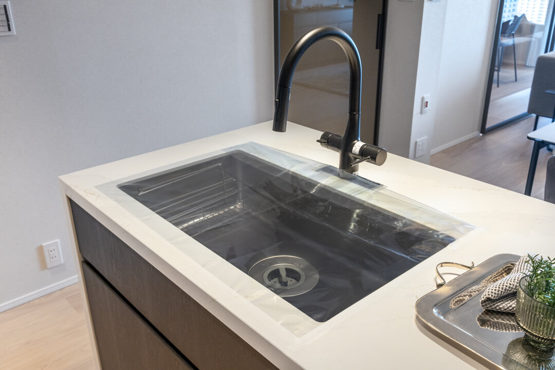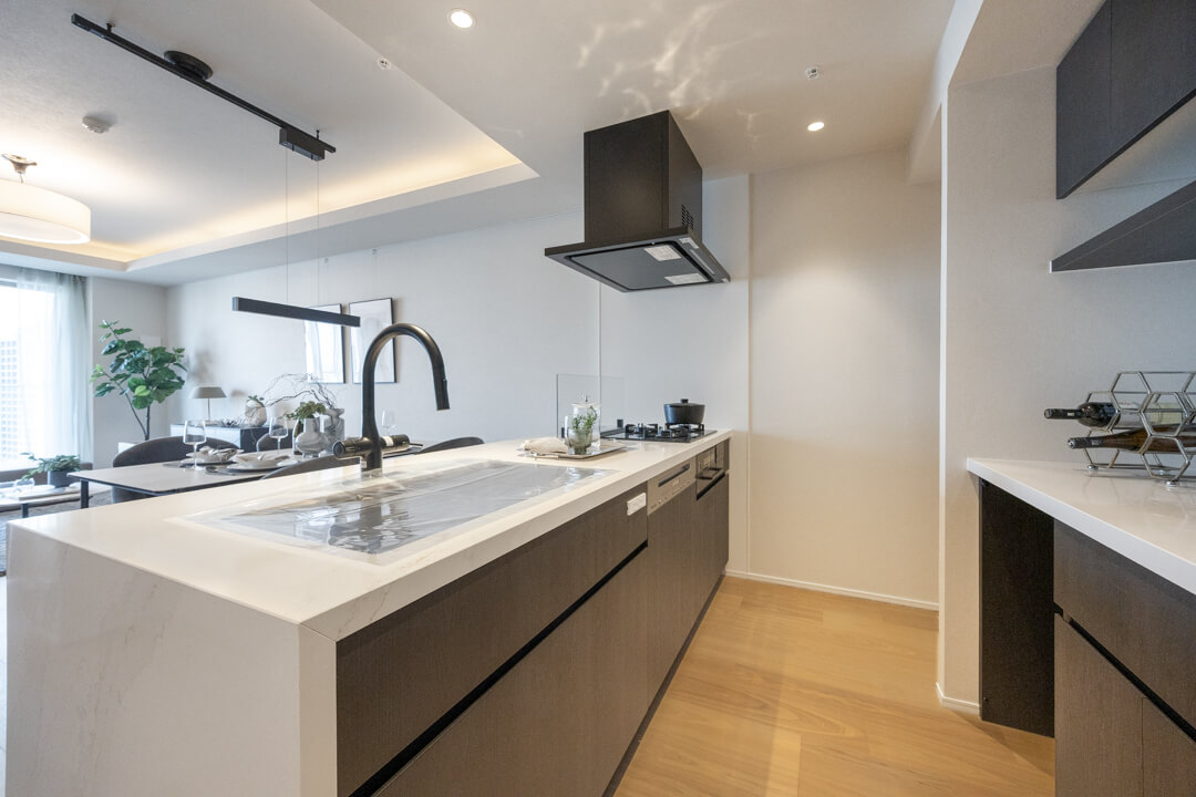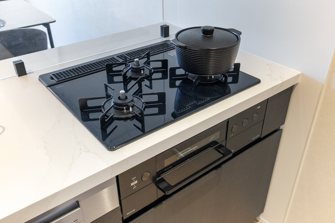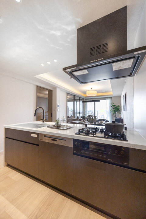 同時調理が叶うグリル付3口ガスコンロに加え、容量の大きさが魅力的なMiele(ミーレ)製の食洗機を内蔵。後片付けが捗り、節水効果も期待できます。さらに、広々としたシンクには便利なディスポーザーを設置。料理後すぐに生ゴミを処理できるので、掃除の手間が軽減され、悪臭の原因を防いでくれますよ。