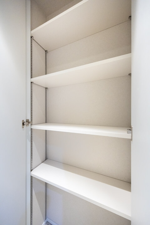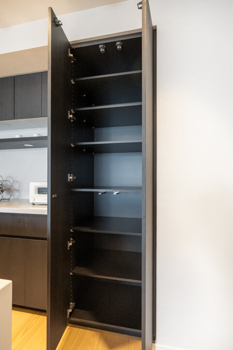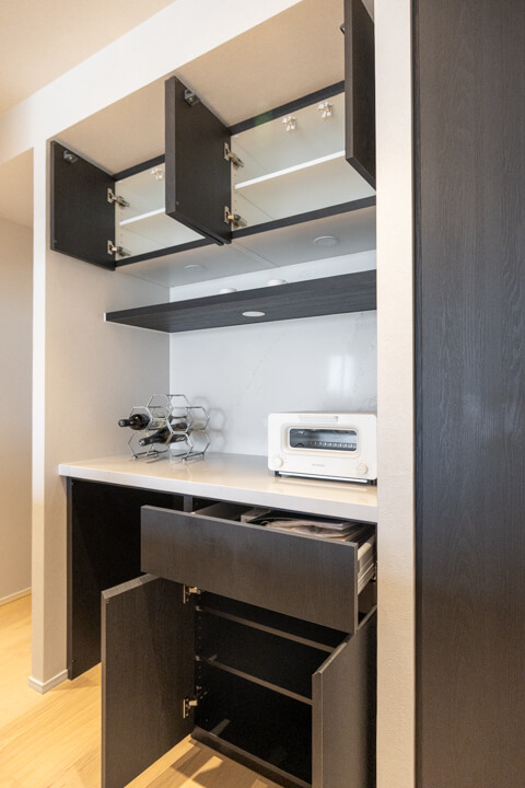 背面にはキッチンと同じデザインのカップボード、収納棚を完備しています。食料品のストックや食器類を整理整頓でき、散らかりがちなキッチンまわりがすっきり片付きそうですね。カウンター下にダストボックスを置けるスペースがあるのも嬉しいポイントです。