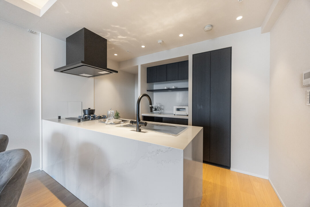 モノトーン調でモダンな雰囲気が漂うキッチン。リビングダイニングを見渡せる、人気の対面タイプです。家族との会話を楽しみながら調理ができ、コミュニケーションが増えそうですね。