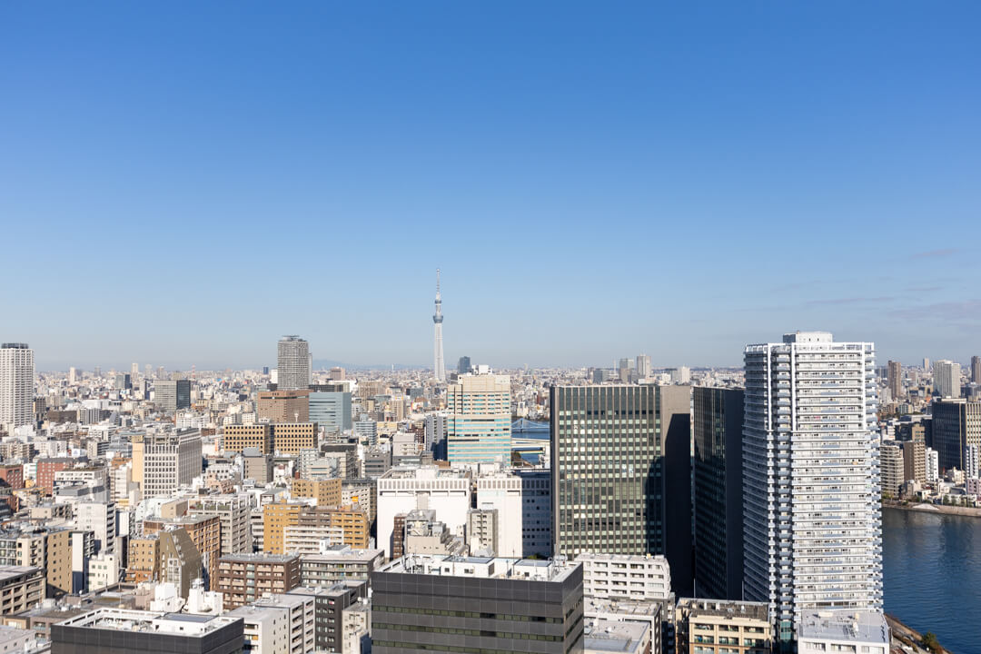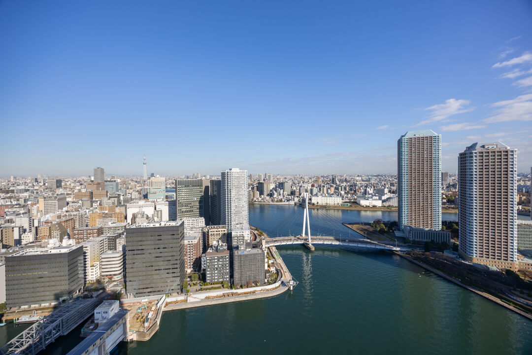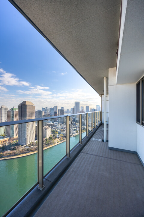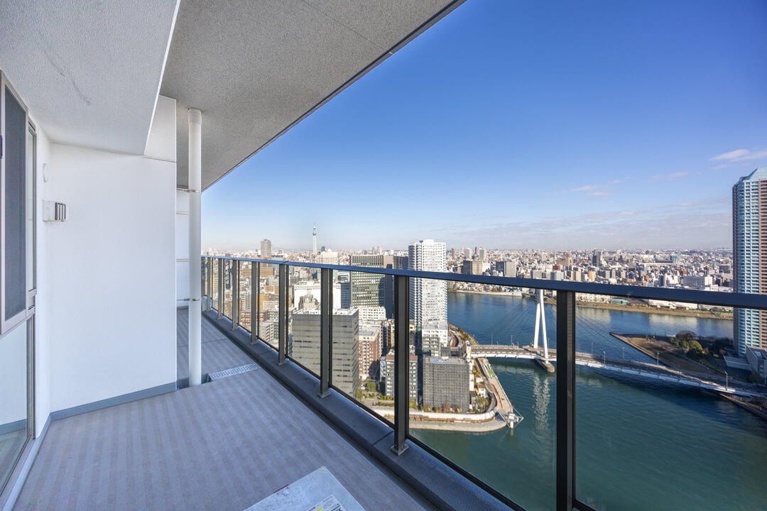 全居室に跨るワイドスパンバルコニー。19.00㎡のゆとりあるスペースです。33階部分につき眺望良好◎。遠く広がる青空と晴海運河、都会ならではのビル群のコントラストを楽しむことができます。北東側には東京スカイツリーも見えますよ(※天候によります)。開放的な眺めを堪能し、ほっと一息つける場所になりそうです。