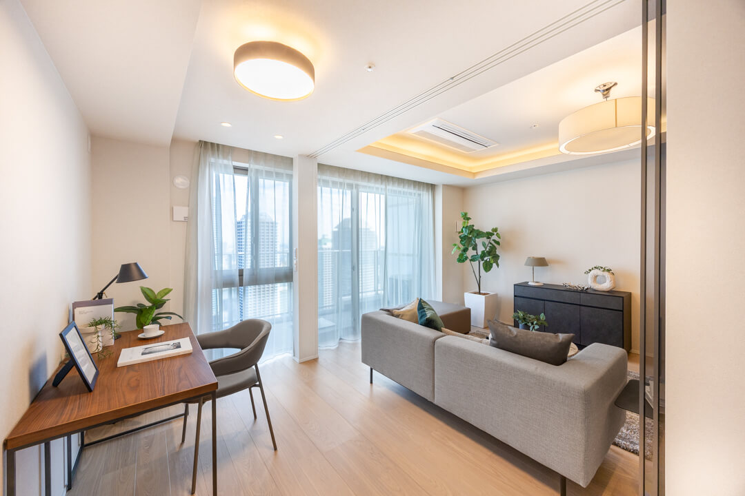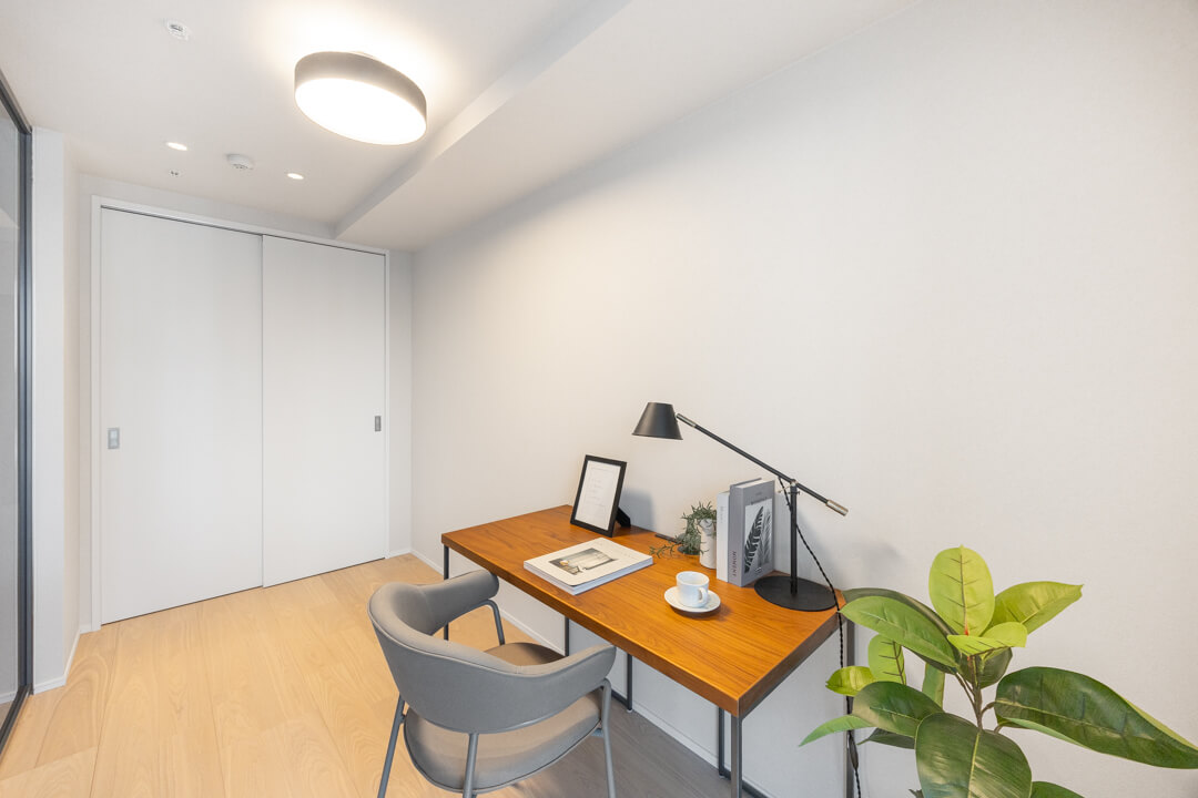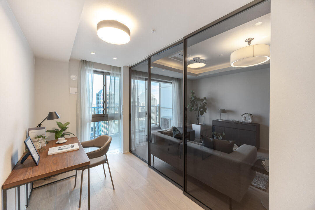 LDKに隣接する洋室3。約4.2帖です。クリアブラックの引き戸を採用していて、リビングとの繋がりを感じながらもほど良いこもり感のある空間です。ワークスペースや趣味部屋に良さそうですね。ゲストが来た時は、扉を開放して拡張リビングとして活用しても◎。シーンに合わせてフレキシブルにお使いください。
