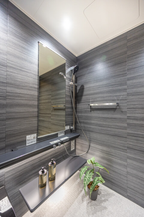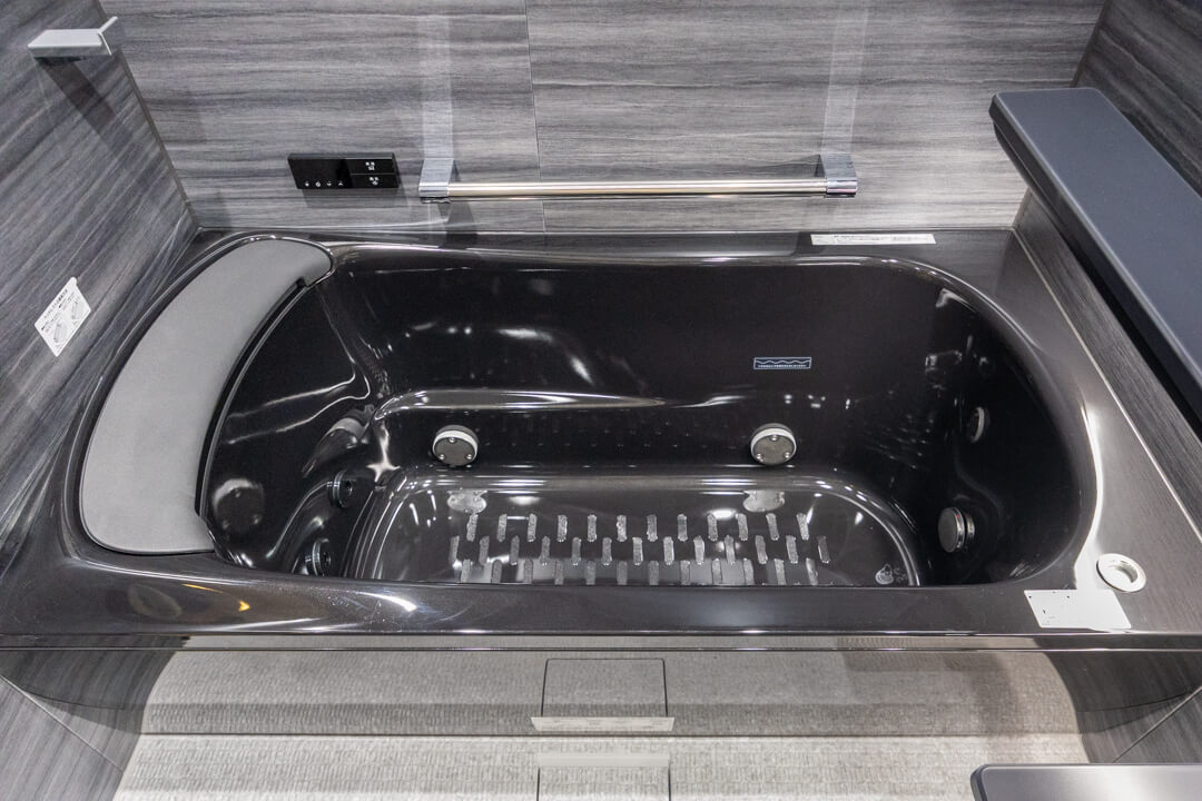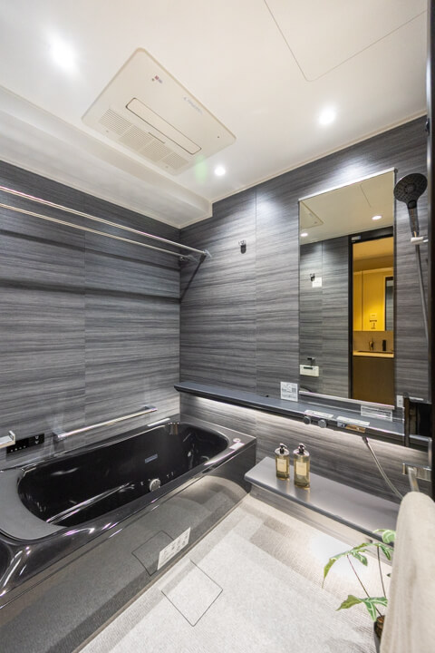 ブラックの浴槽が印象的でシックな雰囲気のバスルーム。浴室換気乾燥暖房機・追い焚き機能に加え、楽湯機能が搭載されています。ヘッドレストの下と腰の位置からお湯が流れ、全身をしっかり温めることができますよ。気分や好みに合わせて流量を変えることができ、至福のリラックスタイムを過ごせそうですね。