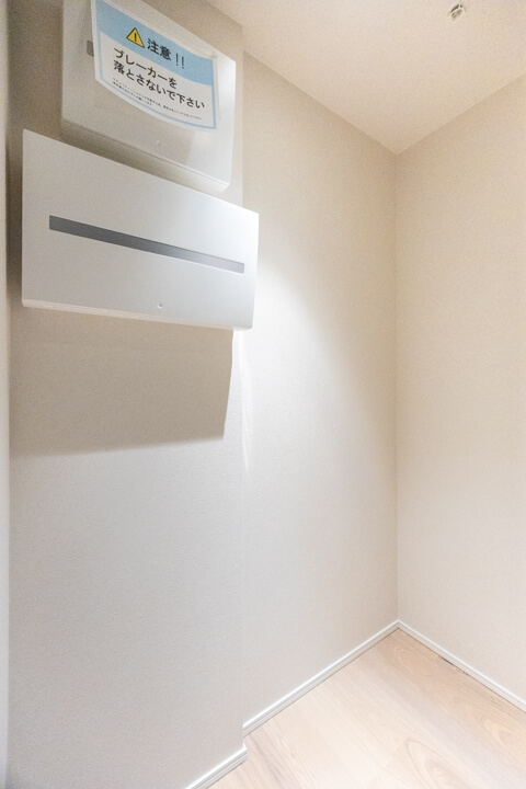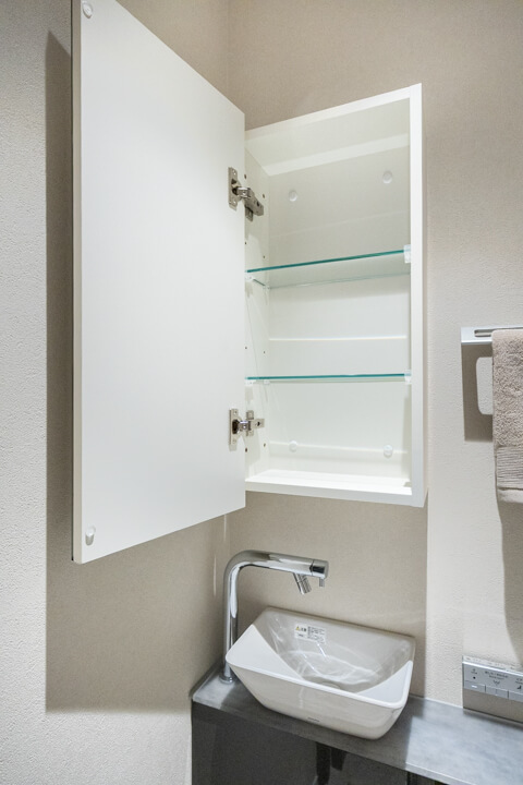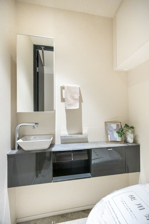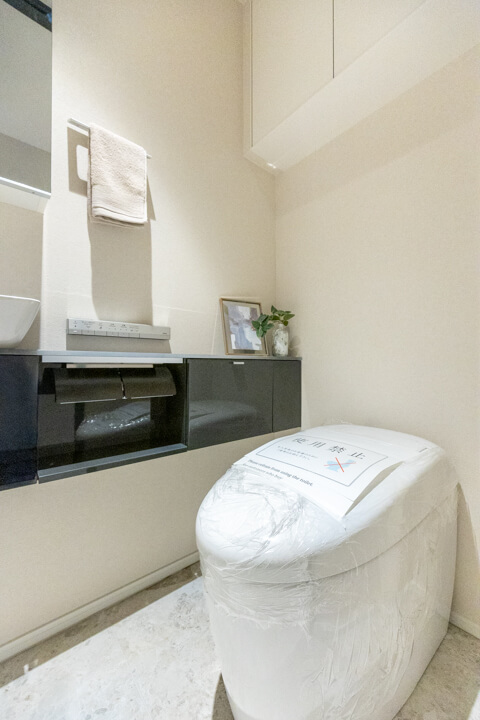廊下に面していて独立性の高いレストルーム。TOTO製の洗浄便座付トイレに新規交換済みです。すっきりとした見た目のタンクレス仕様で、お掃除しやすいのも嬉しいポイント。手洗いカウンターが設置されているのですぐに手を洗うことができ、ゲストを洗面室まで案内する手間もかかりません。