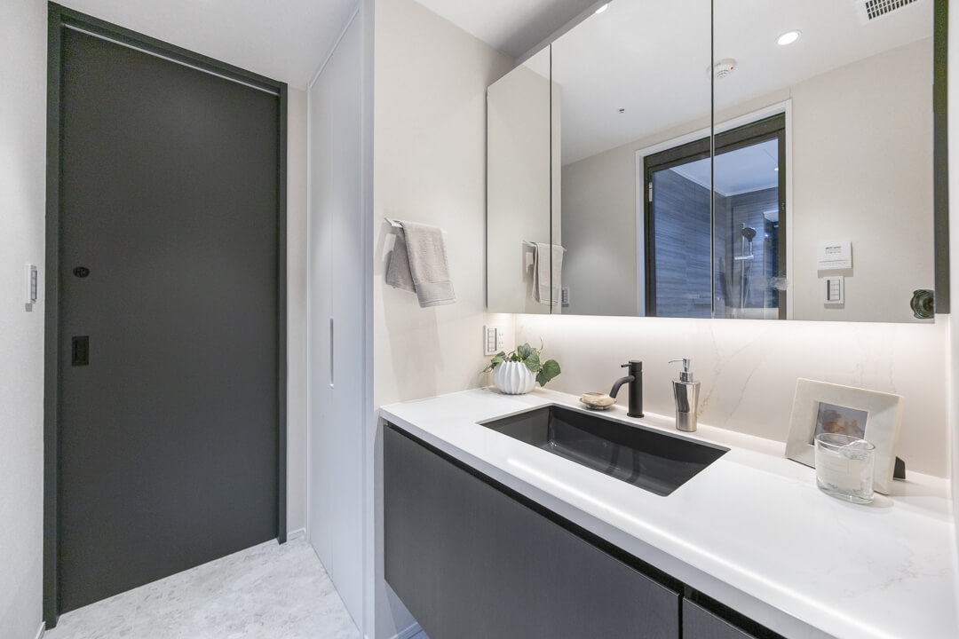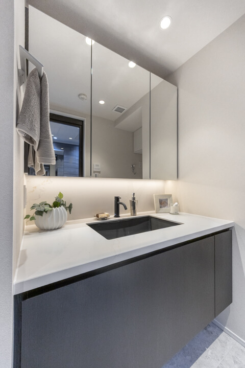 田中工藝製の洗面化粧台。モノトーンのスタイリッシュなデザインです。大きな三面鏡付きで、身だしなみを整えるのに便利ですね。カウンタースペースにはゆとりがあり、化粧品やドライヤーの仮置きが可能。リネン庫付きで収納性の高さも魅力です。