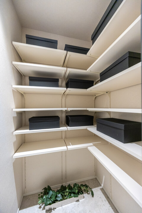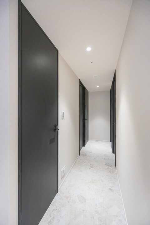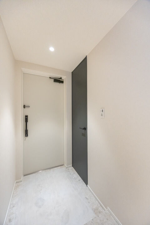 ブラックカラーの建具がアクセントになり、落ち着いた雰囲気が漂う玄関スペース。SIC(シューズインクローゼット)完備で、散らかりがちな靴をすっきり収納できます。廊下には納戸もあり、季節家電や掃除機の収納に重宝しそうです。