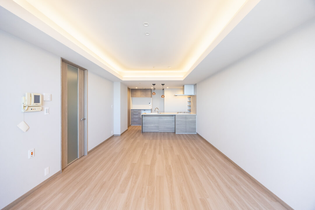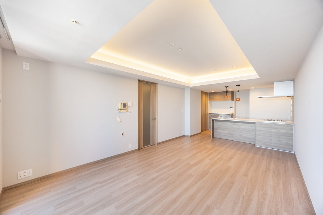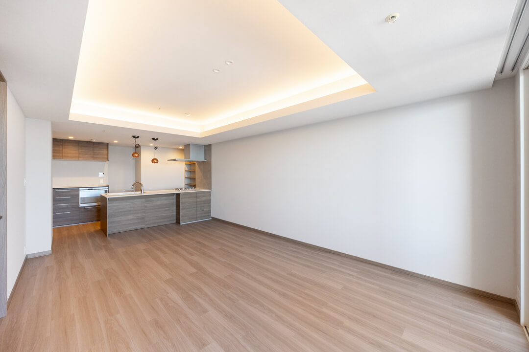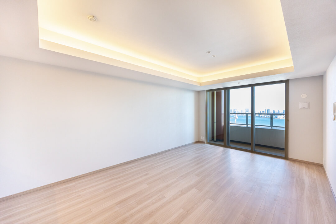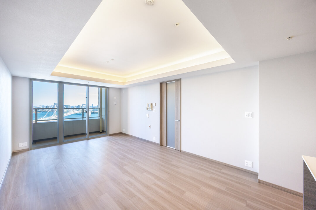 約15帖の広々としたリビングダイニング。折り上げ天井には間接照明が施され、昼は自然光、夜はやわらかな灯りで洗練された空間を演出します。窓の向こうには、運河の穏やかな水面とレインボーブリッジの開放的な眺めが広がり、朝のやわらかな光や夕暮れにきらめく水辺の景色が、リビングで過ごす時間を特別なものにしてくれます。