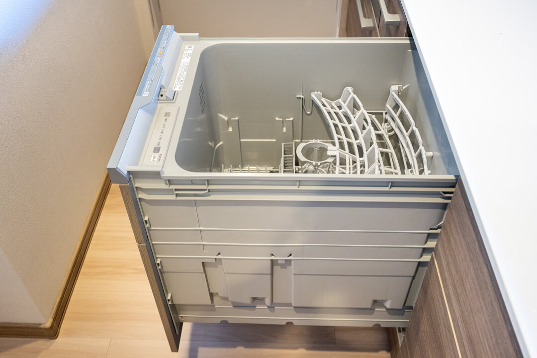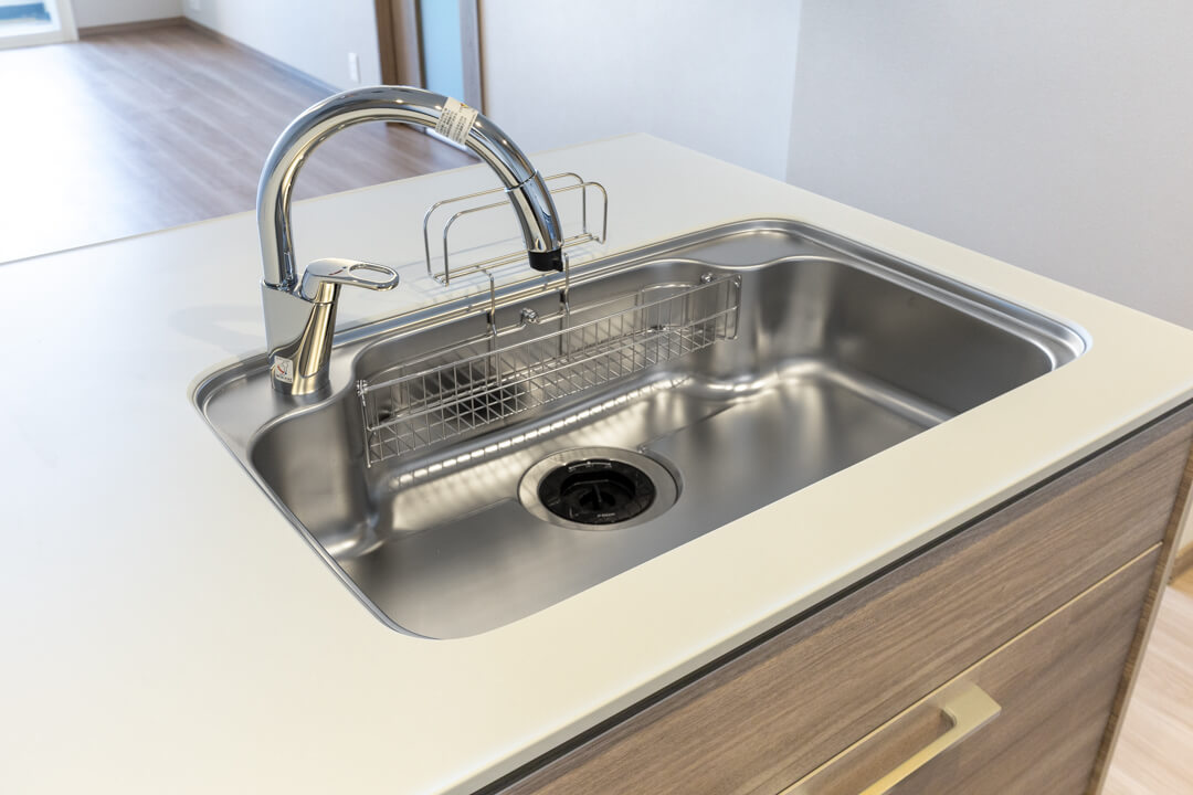 広々としたシンクには便利なディスポーザーを設置。料理後すぐに生ゴミを処理できるので、掃除の手間が軽減され、悪臭の原因を防いでくれます。食洗機も内蔵されていて、後片付けの時短が叶いますよ。