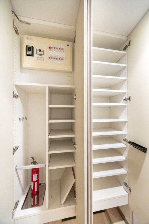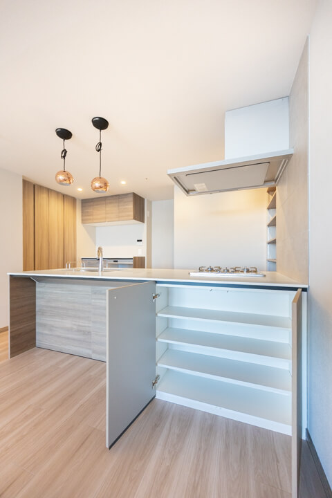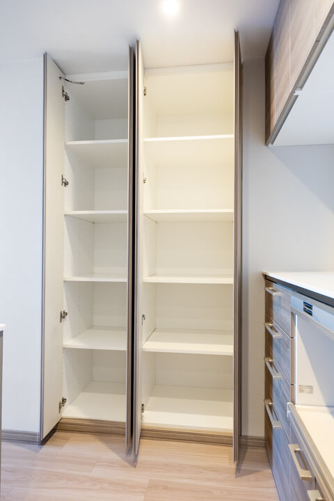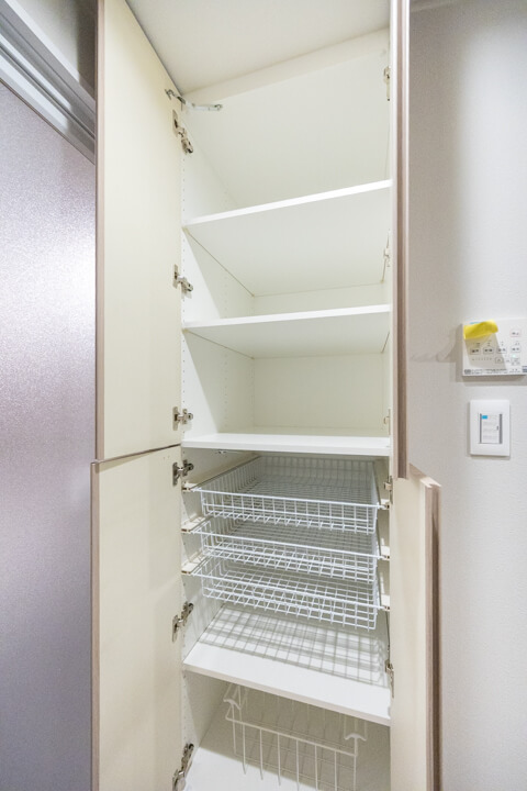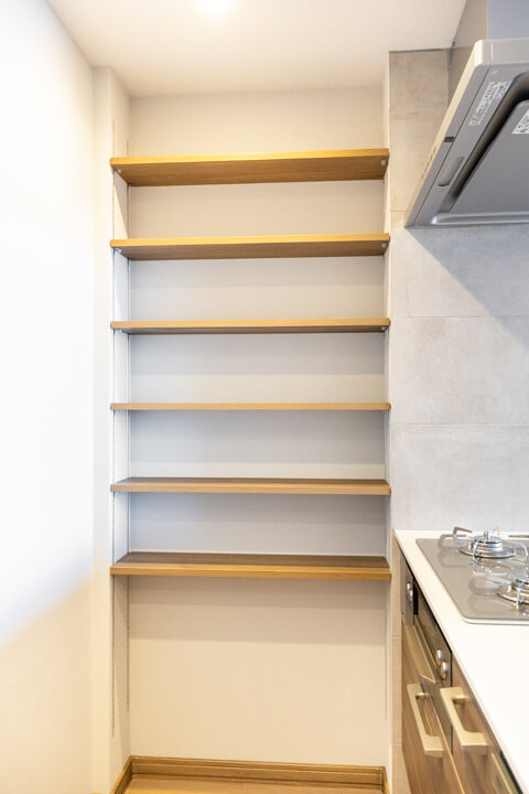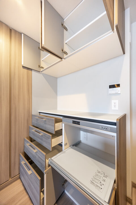 カップボード&パントリー、可動棚付きで収納スペースも充実しています。食料品のストックや食器類を整理整頓でき、いつも清潔なキッチン空間をキープできそうですね。カウンター&トレイボードにはコンセントが付いているので、炊飯器やコーヒーメーカーといったキッチン家電の使用に便利です。