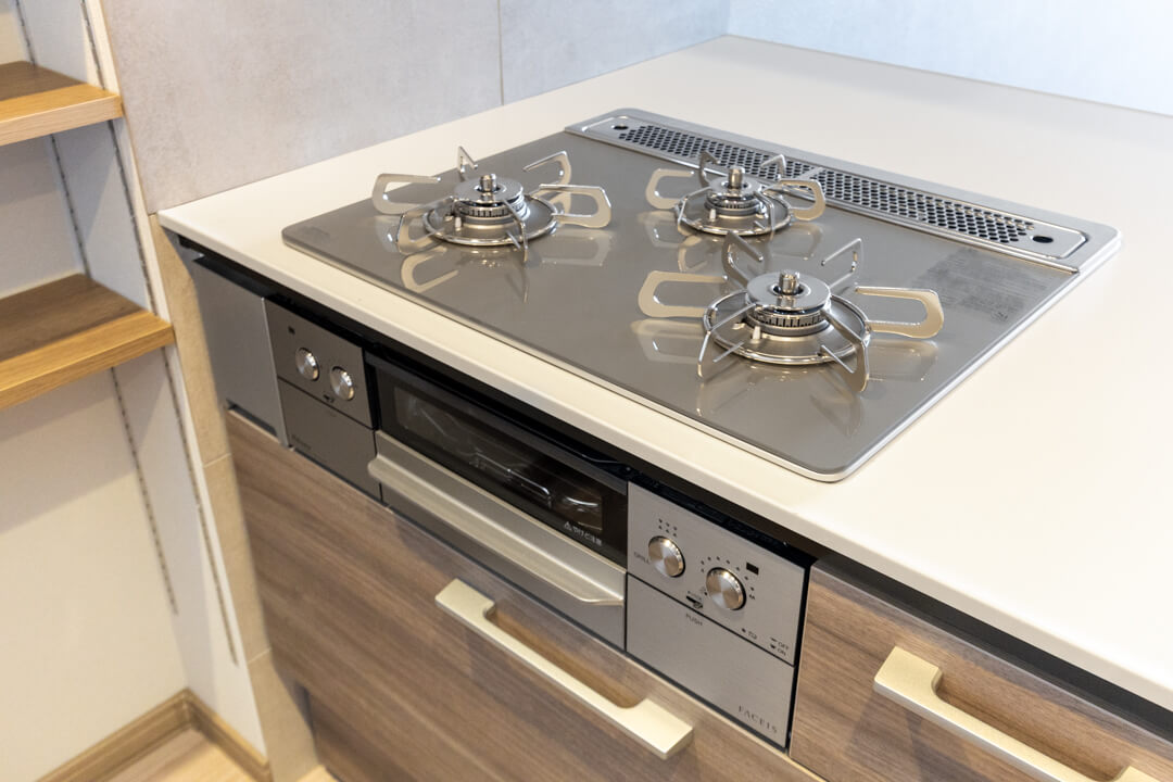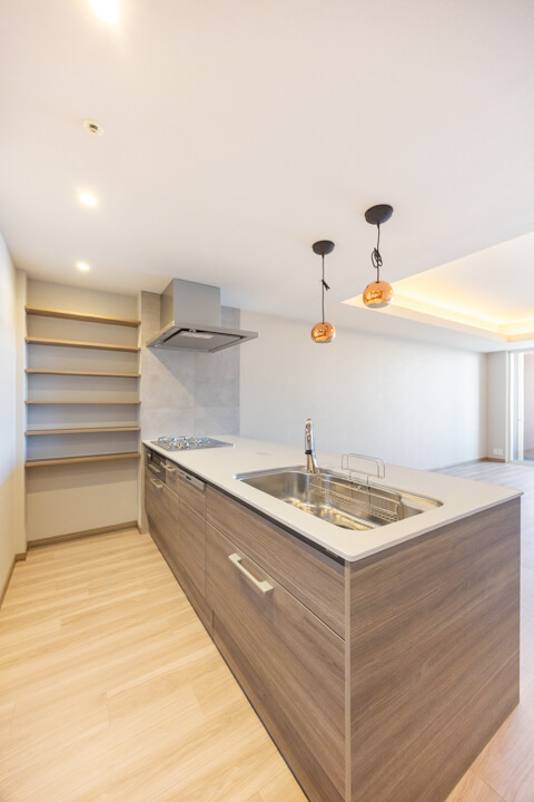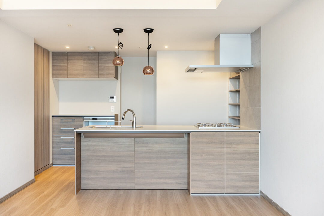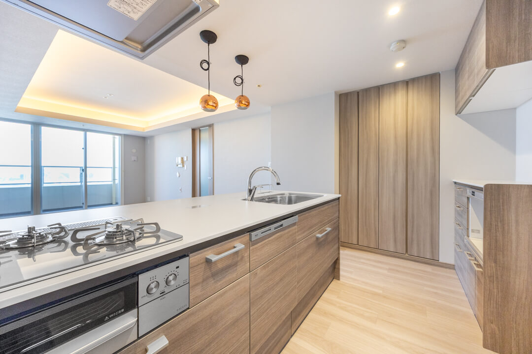 木目デザインが空間に調和するキッチン。リビングダイニングを見渡せる、開放的な対面タイプです。家族やゲストとの会話を楽しみながら調理ができますね。キッチン時間が楽しくなりそうです。