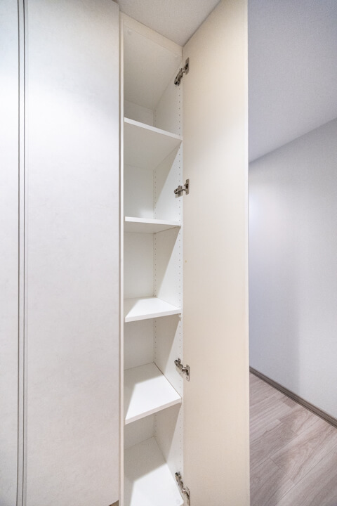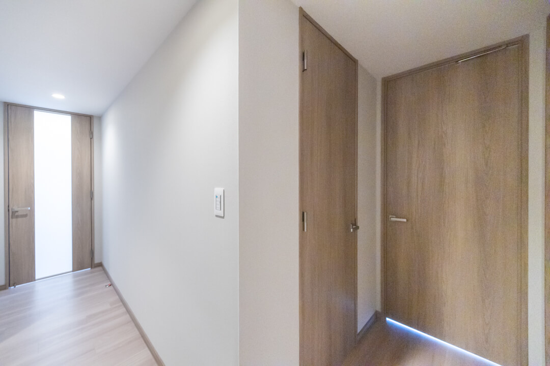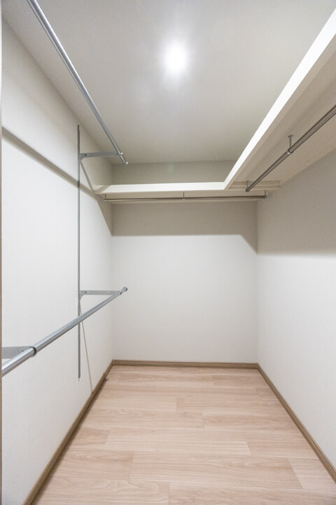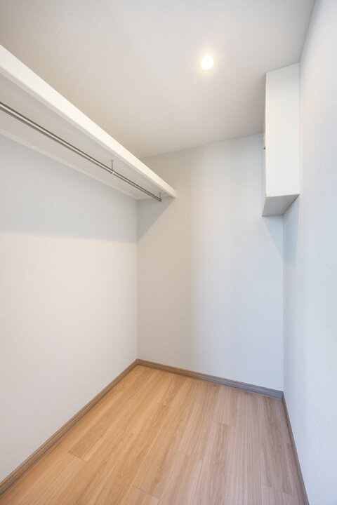 廊下にもWIC(ウォークインクローゼット)があり、ファミリークローゼットとしてご活用いただけます。お部屋に入る前にコート類を収納できて、衛生面でも嬉しいですね。トランクケースやゴルフバッグなど、大きな荷物の収納にも便利。すっきりとした居住空間を実現できそうです。