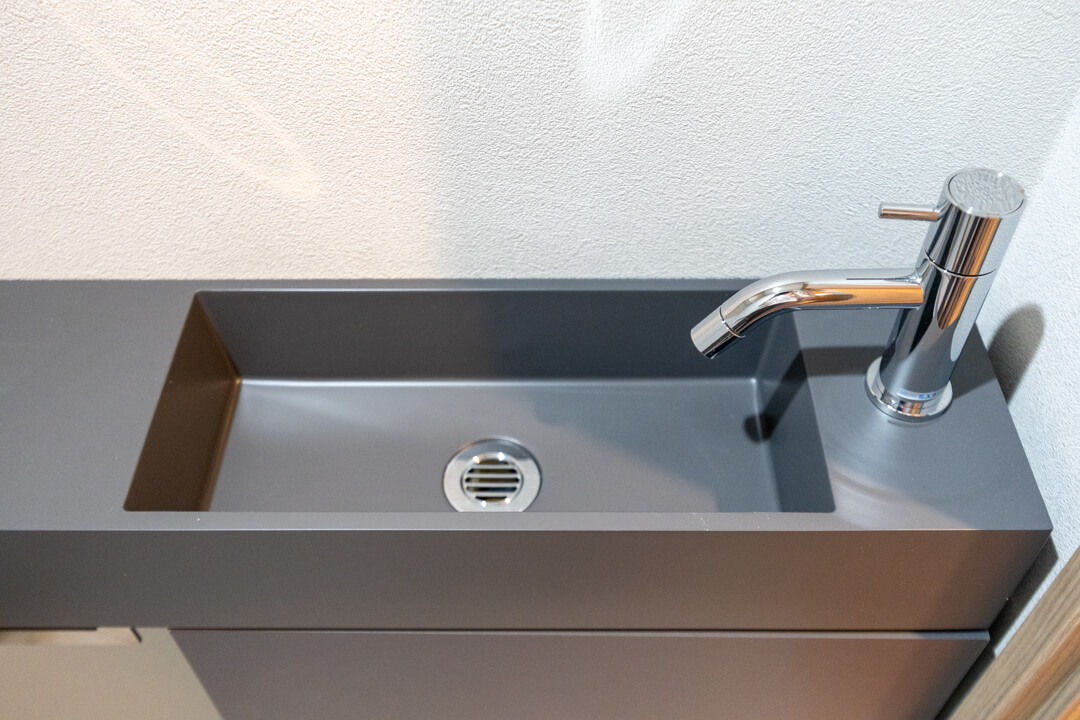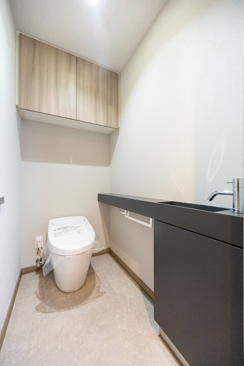 廊下に面していて独立性の高いレストルーム。LIXIL製の洗浄機能付トイレを採用しています。タンクレス仕様ですっきりとした印象ですね。ブラックトーンでスタイリッシュな手洗いカウンターも完備。すぐに手を洗うことができて衛生的です。