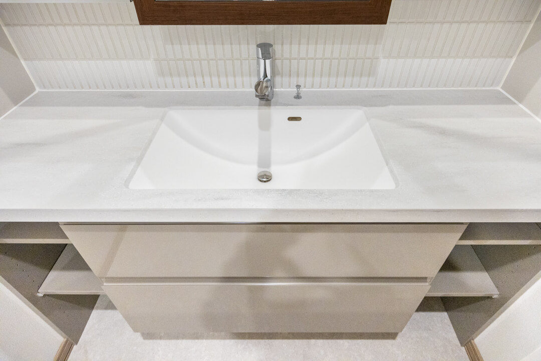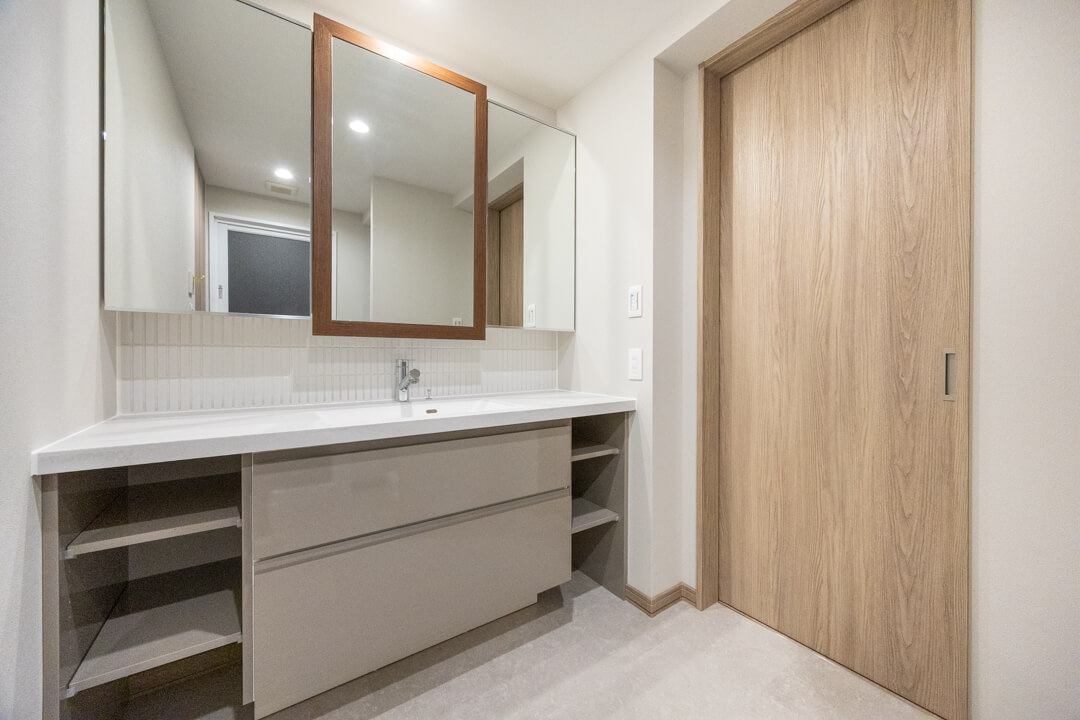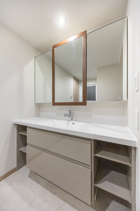 デザイン性の高い三面鏡が印象的な洗面化粧台。カウンタースペースにゆとりがあり、化粧品やドライヤーの仮置きができます。忙しい朝の身支度も落ち着いて行えそうですね。使用頻度の高いタオルなどは足元の棚に収納すると◎。パジャマや洗濯用品の収納に便利なリネン庫も完備しています。