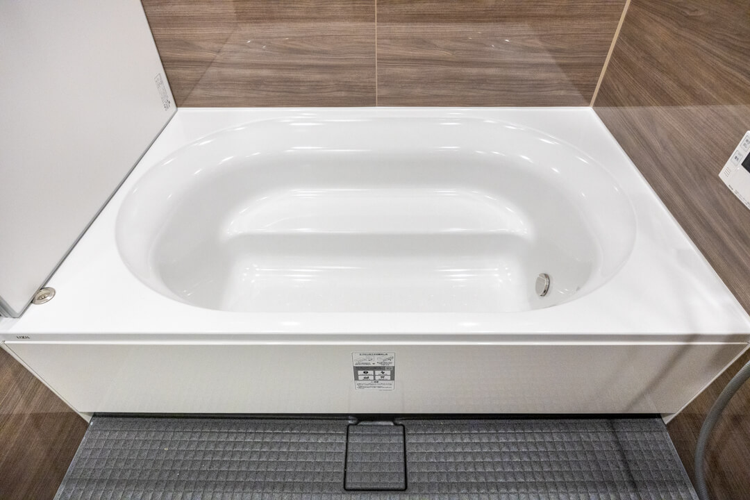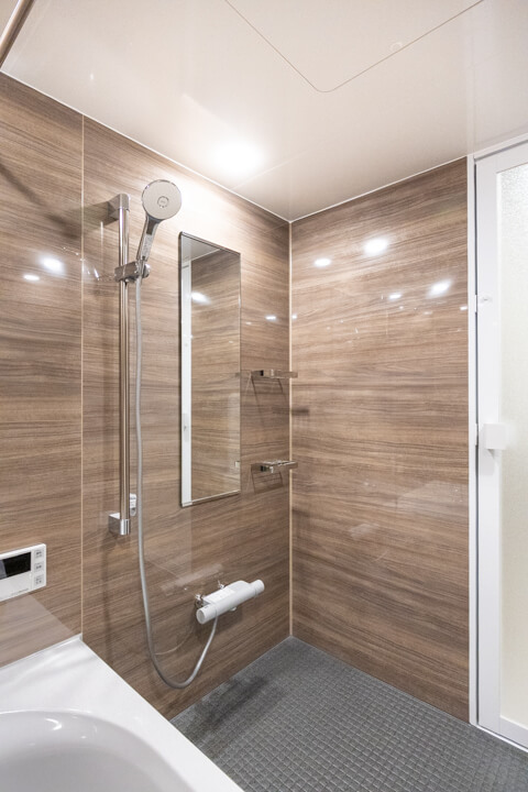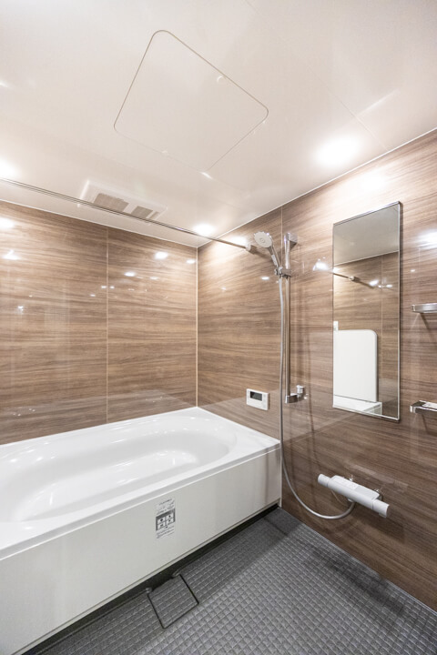 光沢のある木目柄パネルが上質な雰囲気を演出するバスルーム。ゆったり半身浴を楽しめる追い焚き機能付きです。浴槽にベンチが付いているのも嬉しいポイントですね。浴室乾燥機も完備していて、1年中快適なバスタイムを過ごせそうです。